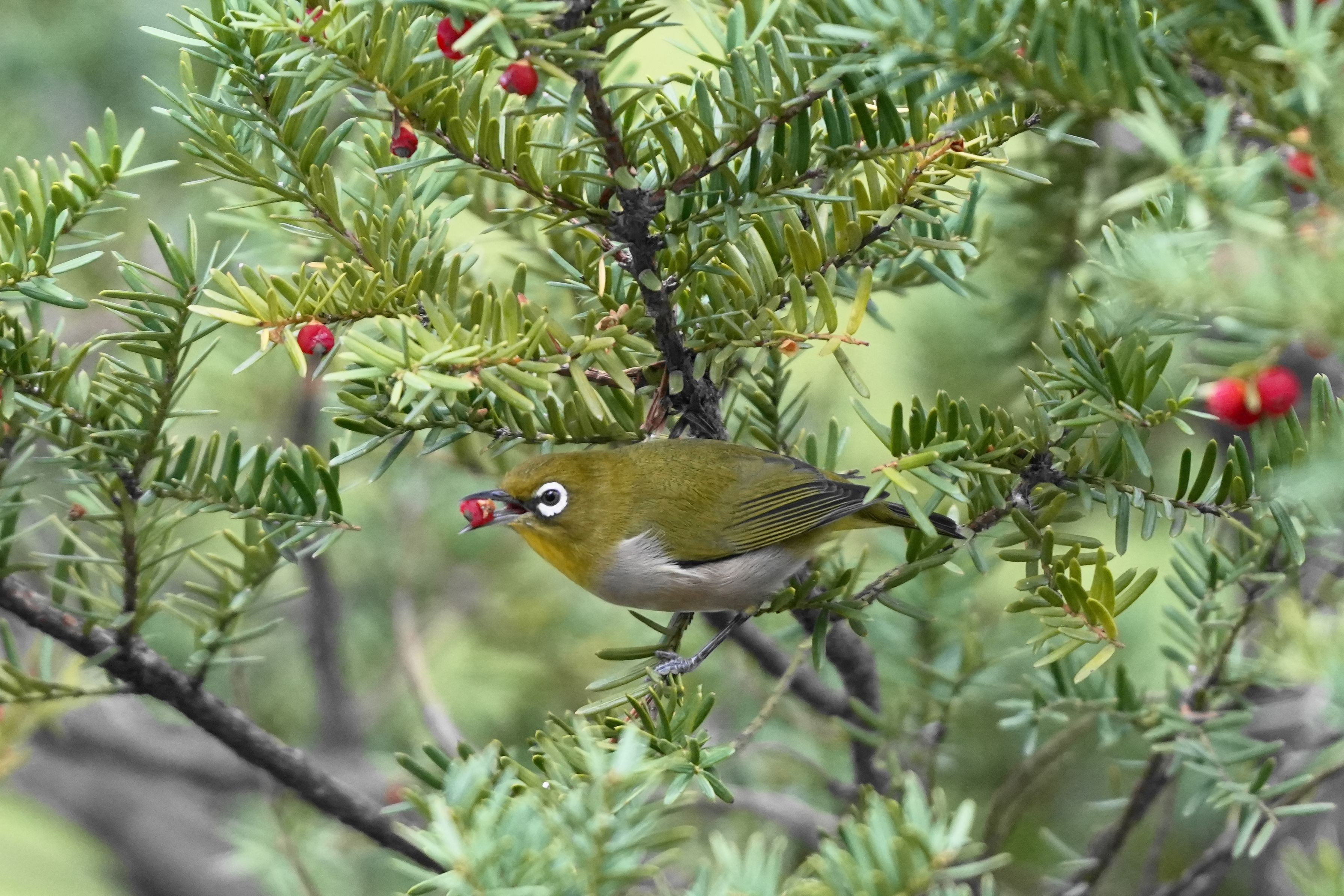 オンコの実を食べにきたメジロさんを撮影しました。今秋は、ナナカマドやマユミの実が全然実らず冬の野鳥撮影が心配になります。