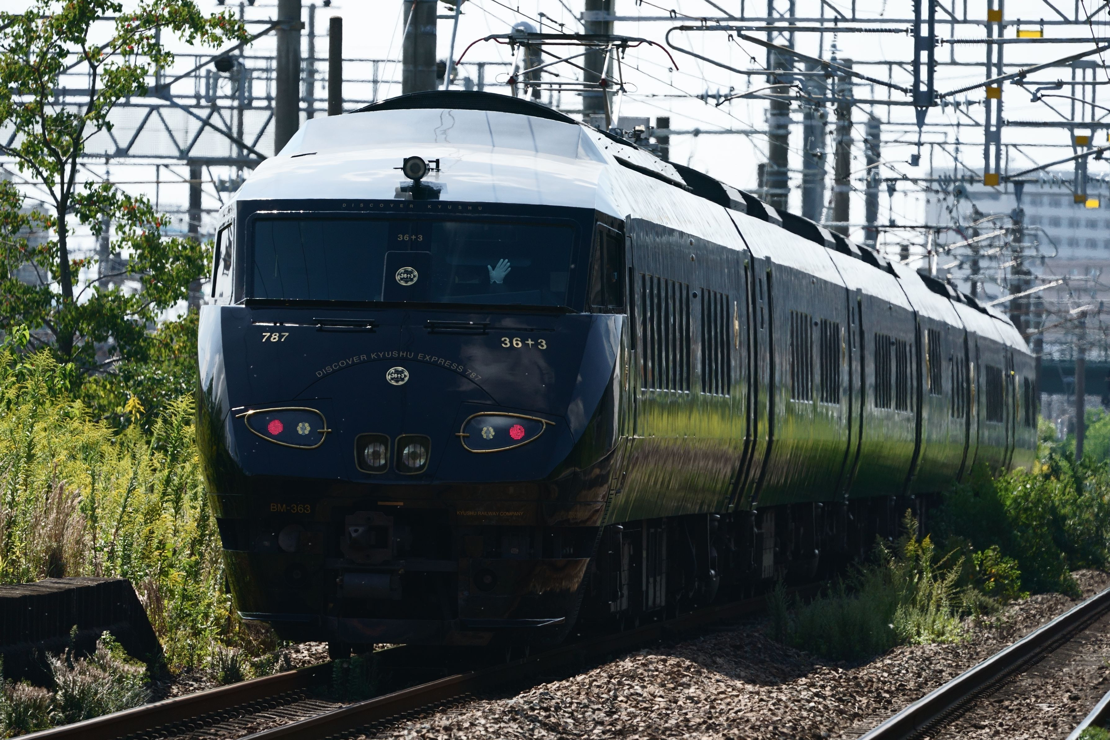 鹿児島本線田代駅を通過するJR九州観光列車「36+3」です。車掌さんが手を振ってくれてます。