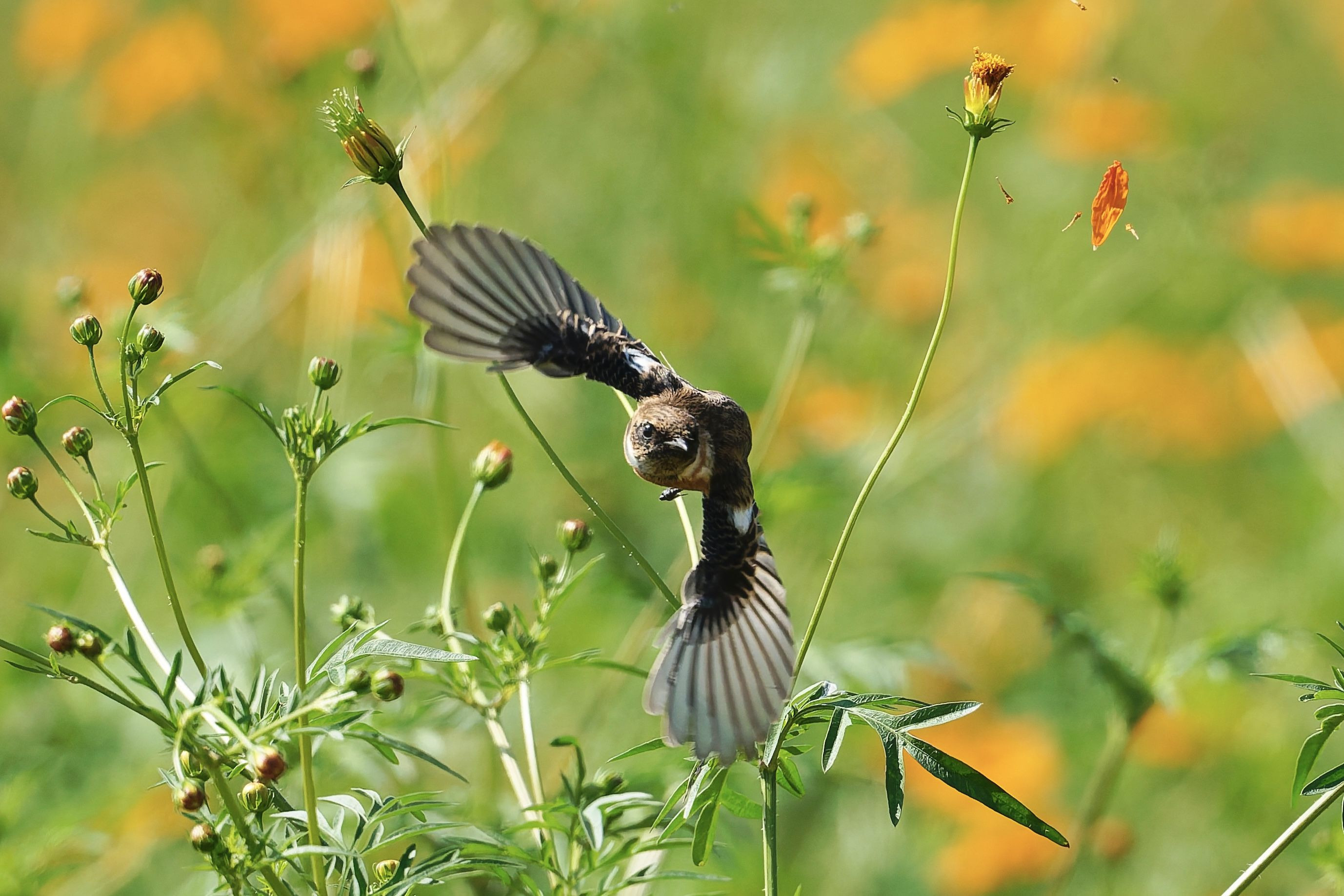 キバナコスモスからの飛び出しをねらって撮影しました