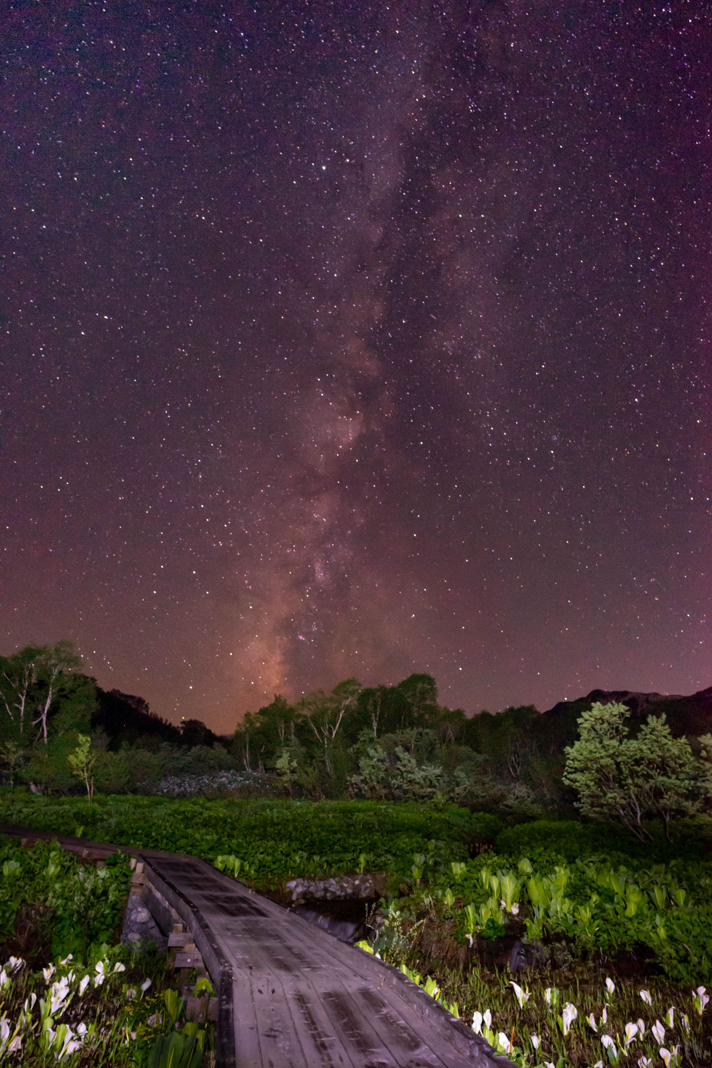 栂池自然園で撮影した天の川です、カメラと三脚の影が入らないように照明を工夫しました。