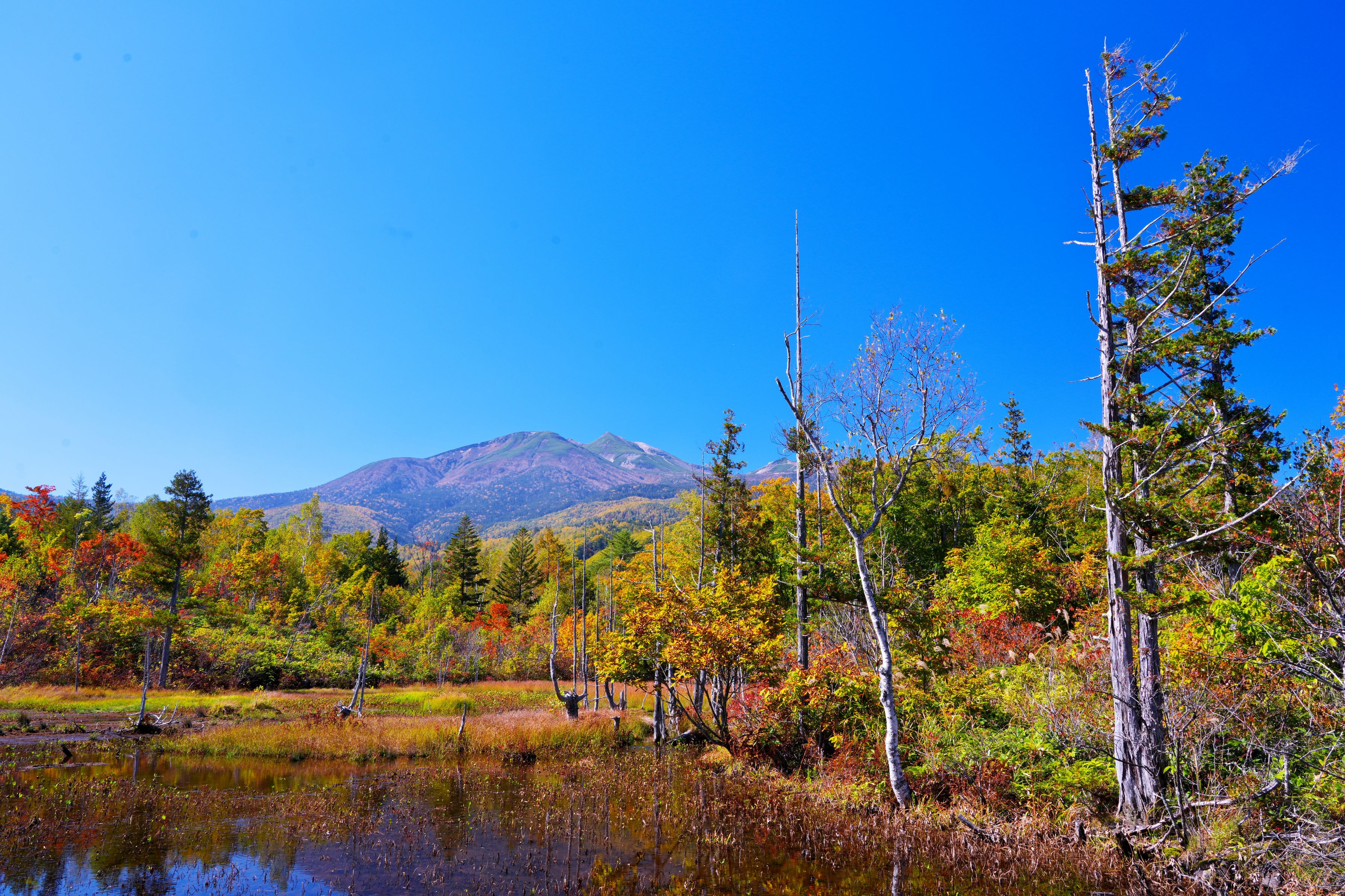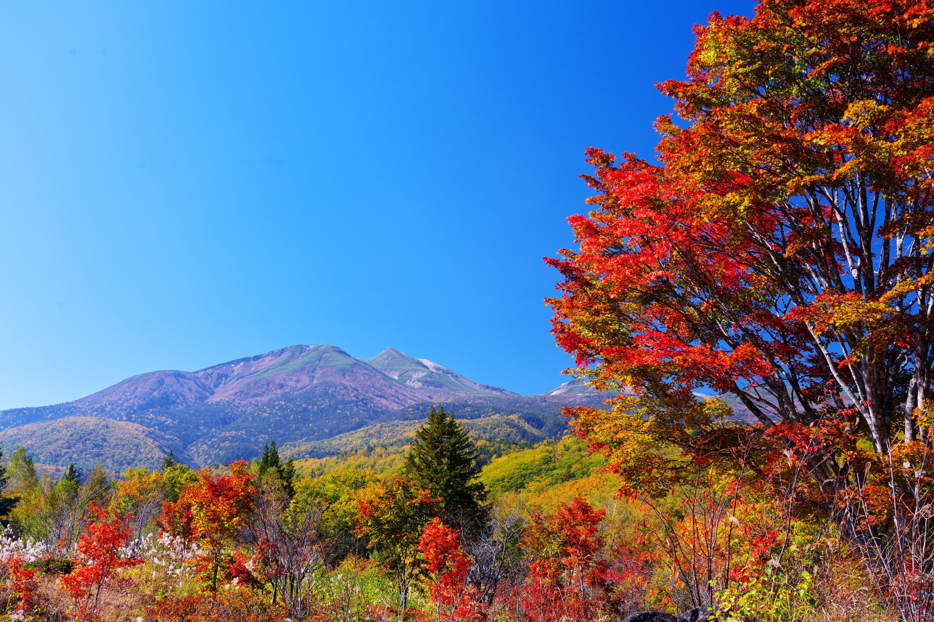 紅葉が見頃を迎えている乗鞍高原。残念ながら今年も乗鞍岳に冠雪はありませんでした。