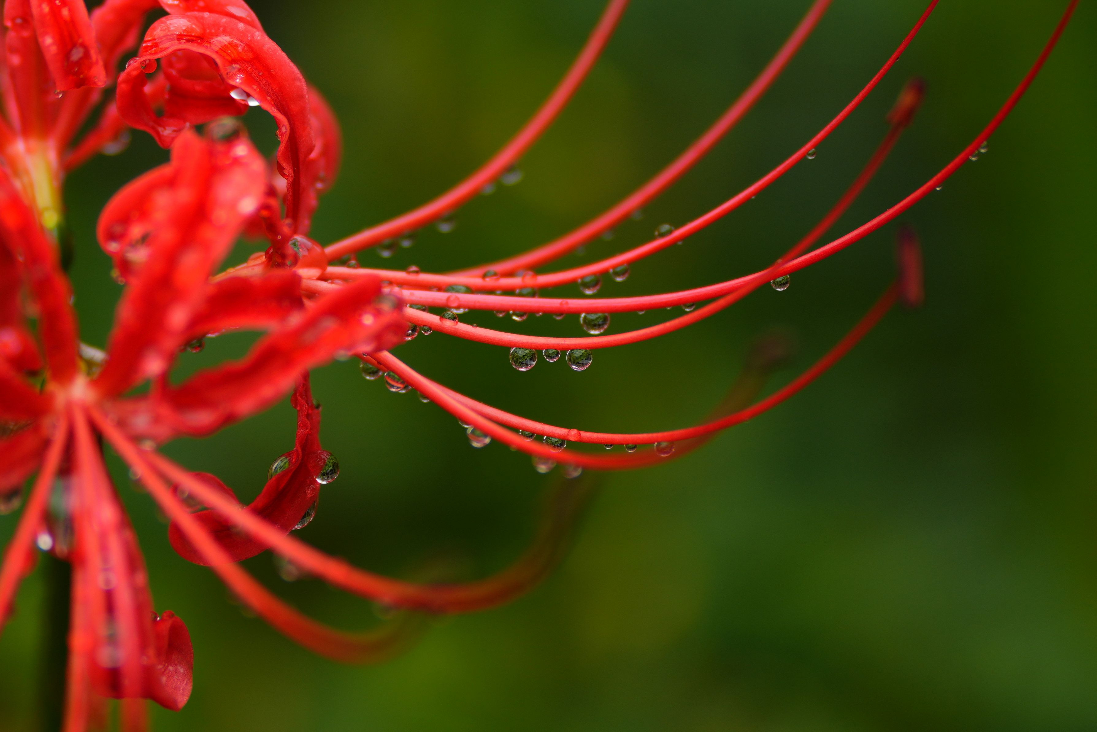 雨上がりに彼岸花から垂れる露を捉えてみました。
