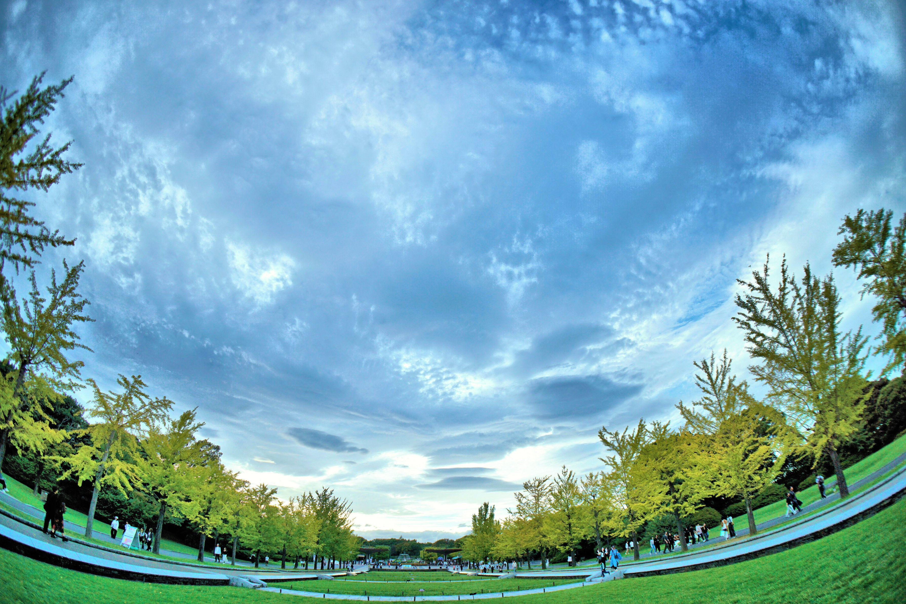 昭和記念公園(立川口)のイチョウが色付き始めておりました。(フィッシュアイにて。)