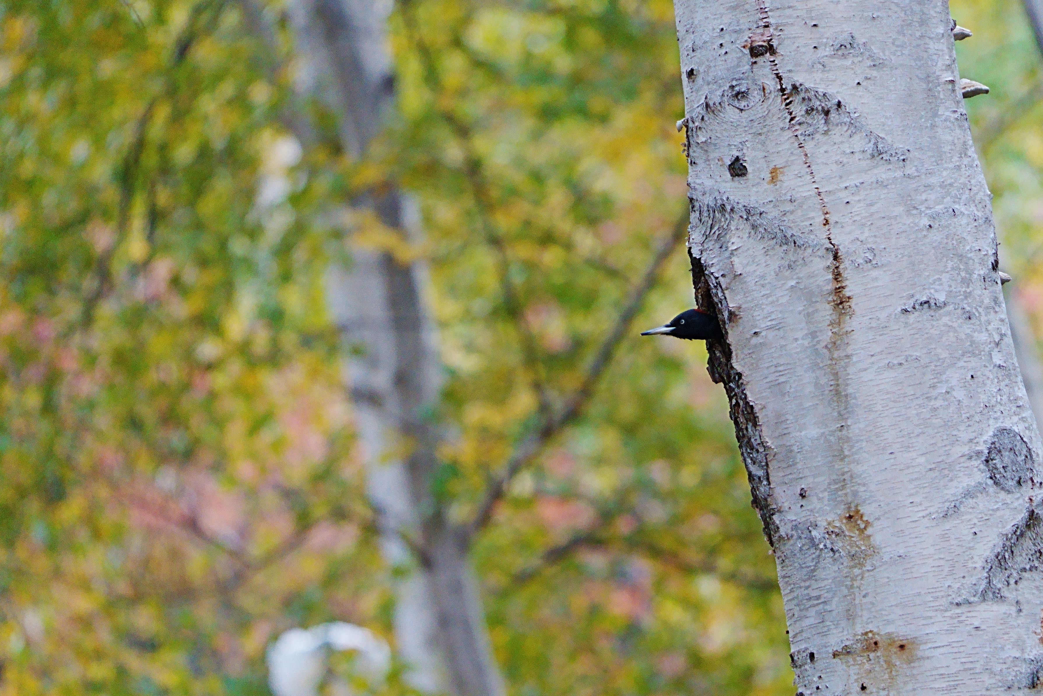 木の葉が色付き始めた林の中、クマゲラが顔を出し辺りを見渡してました。