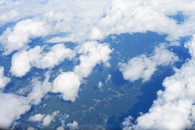 釧路空港→羽田空港の飛行機から撮影した一枚。 雲の切れ間から無数の風車がはっきりと見え。雲の影が地面に映る様はダイナミックな非日常の光景でした。
