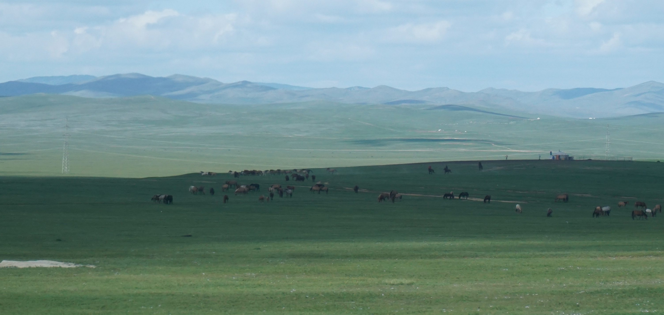 緑と青のグラデーション絨毯のようなモンゴル大草原に群がる馬や羊。走行観光バス車窓からの撮影です。