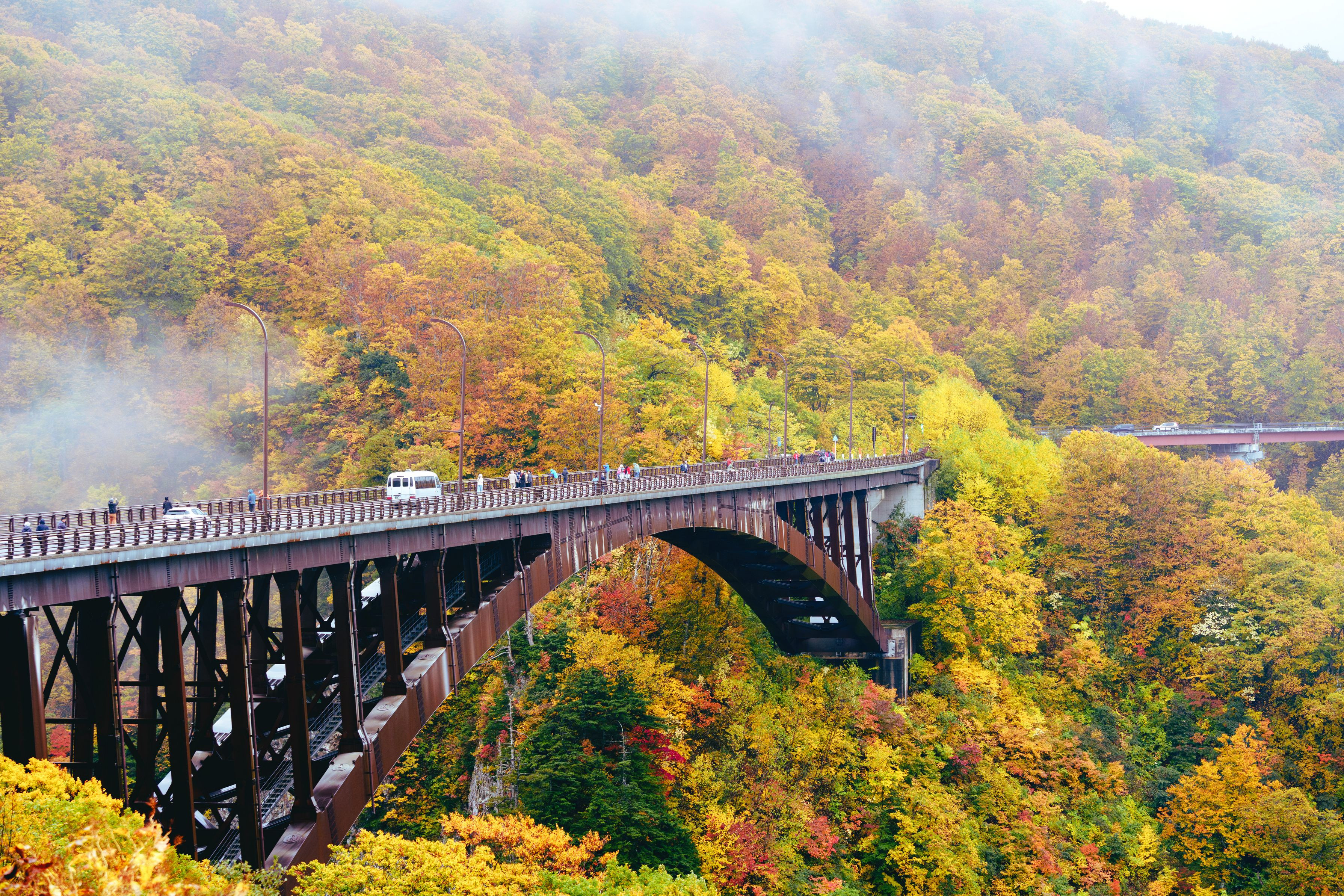数日前に八甲田の方で紅葉が見頃だということで、雨の日ですが城ヶ倉大橋に行ってきました。綺麗に色づいて観光の方がたくさんいらっしゃいました。霧がかって良い雰囲気の写真が撮れました(^o^)