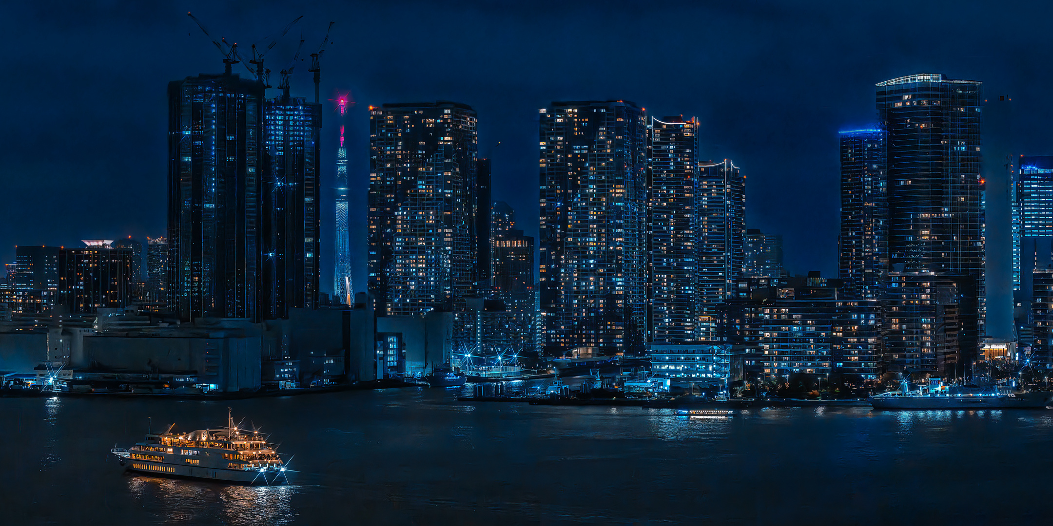 高層ビルの間に浮かぶスカイツリー。 キレイでした。 パノラマ合成です。
