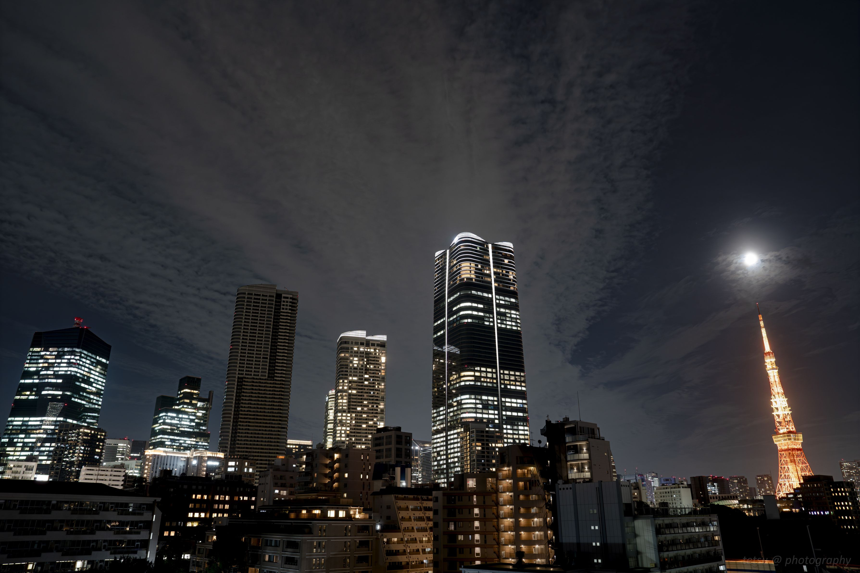 17夜、立ち待ち月の作品をもう一点。お月様がタワーの上空に顔を出すのを待って、都市景観とともに撮影した一枚です。