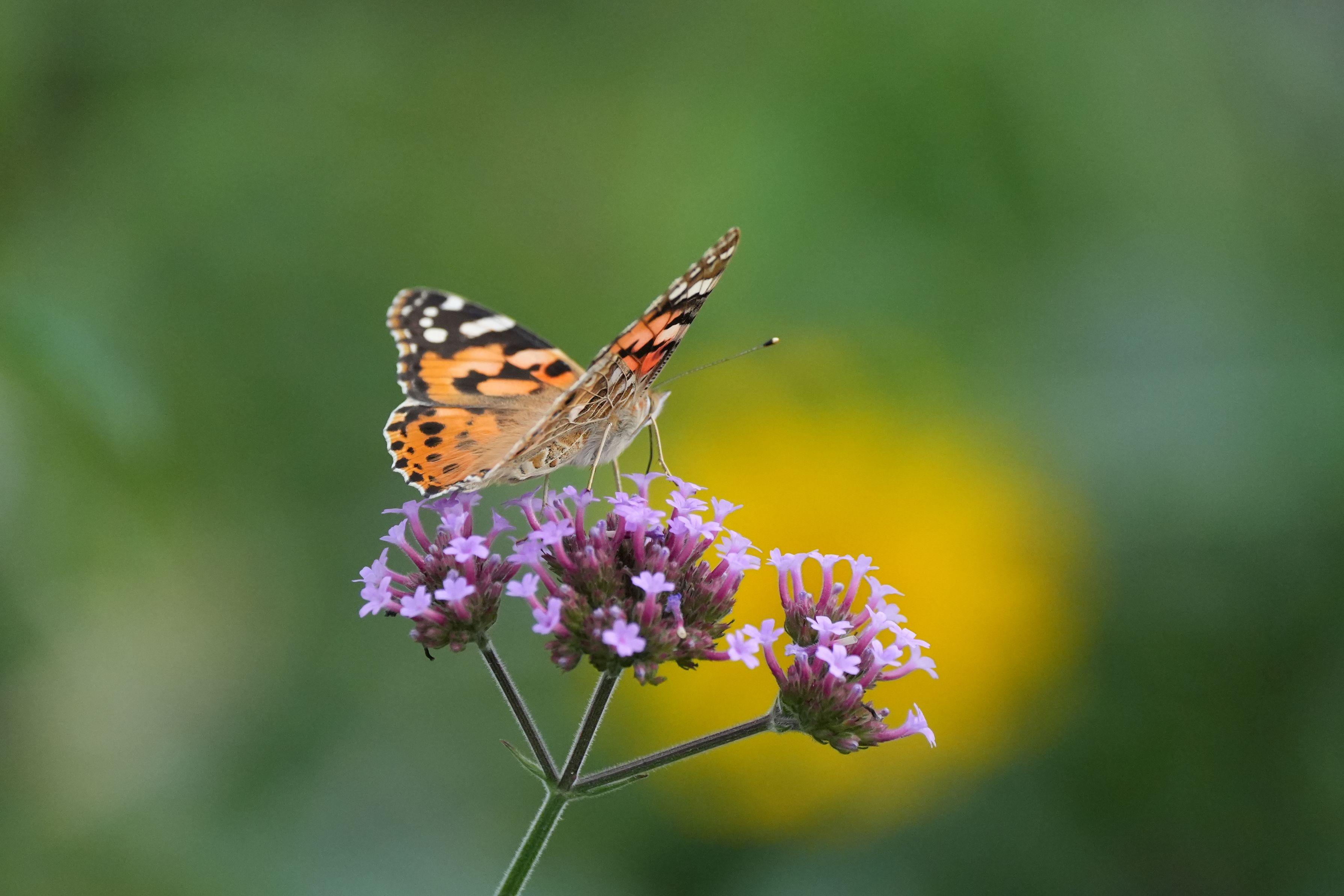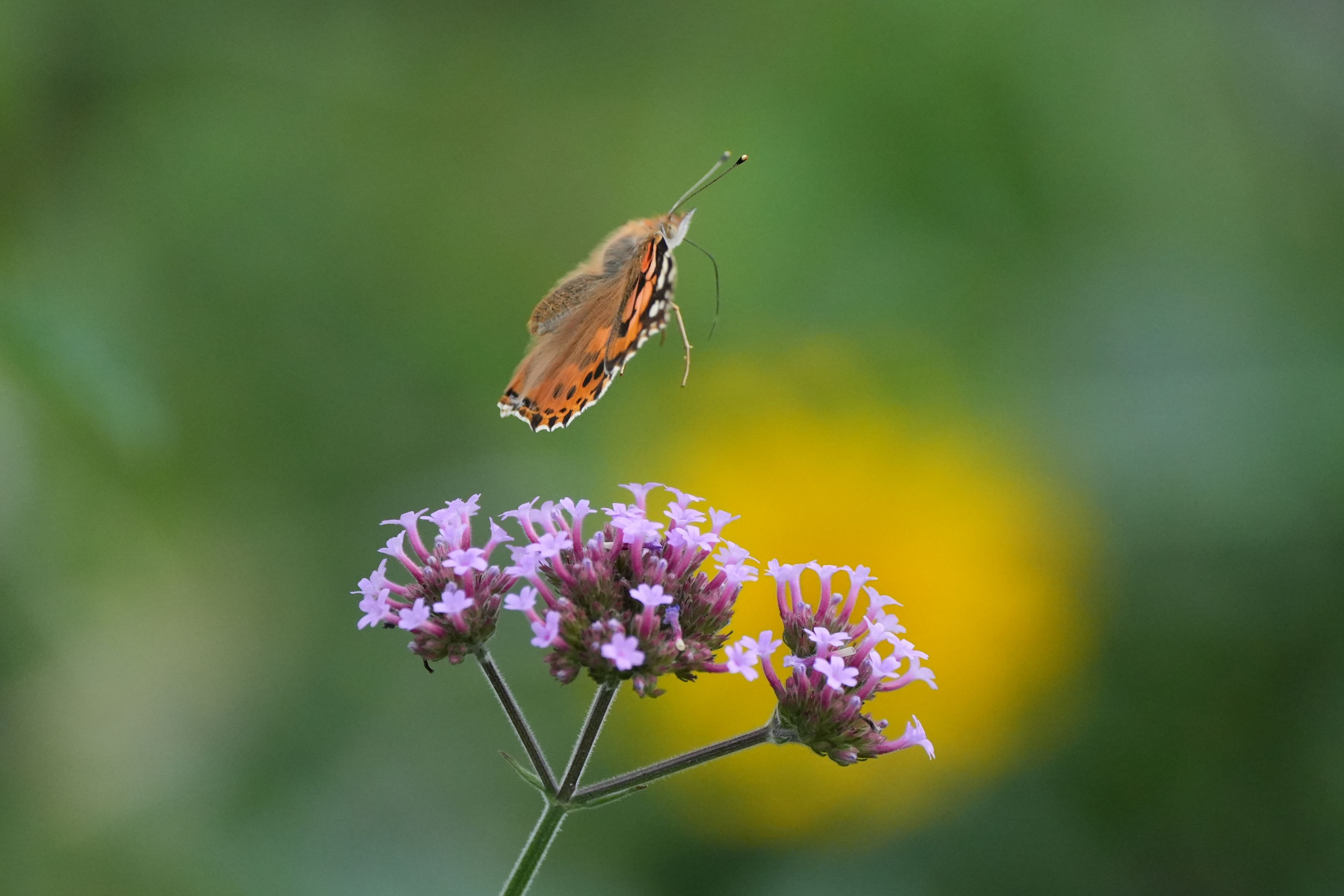 ヤナギハナガサに止まっていたヒメアカタテハがウルトラマンの様に 飛び立った瞬間でした。
