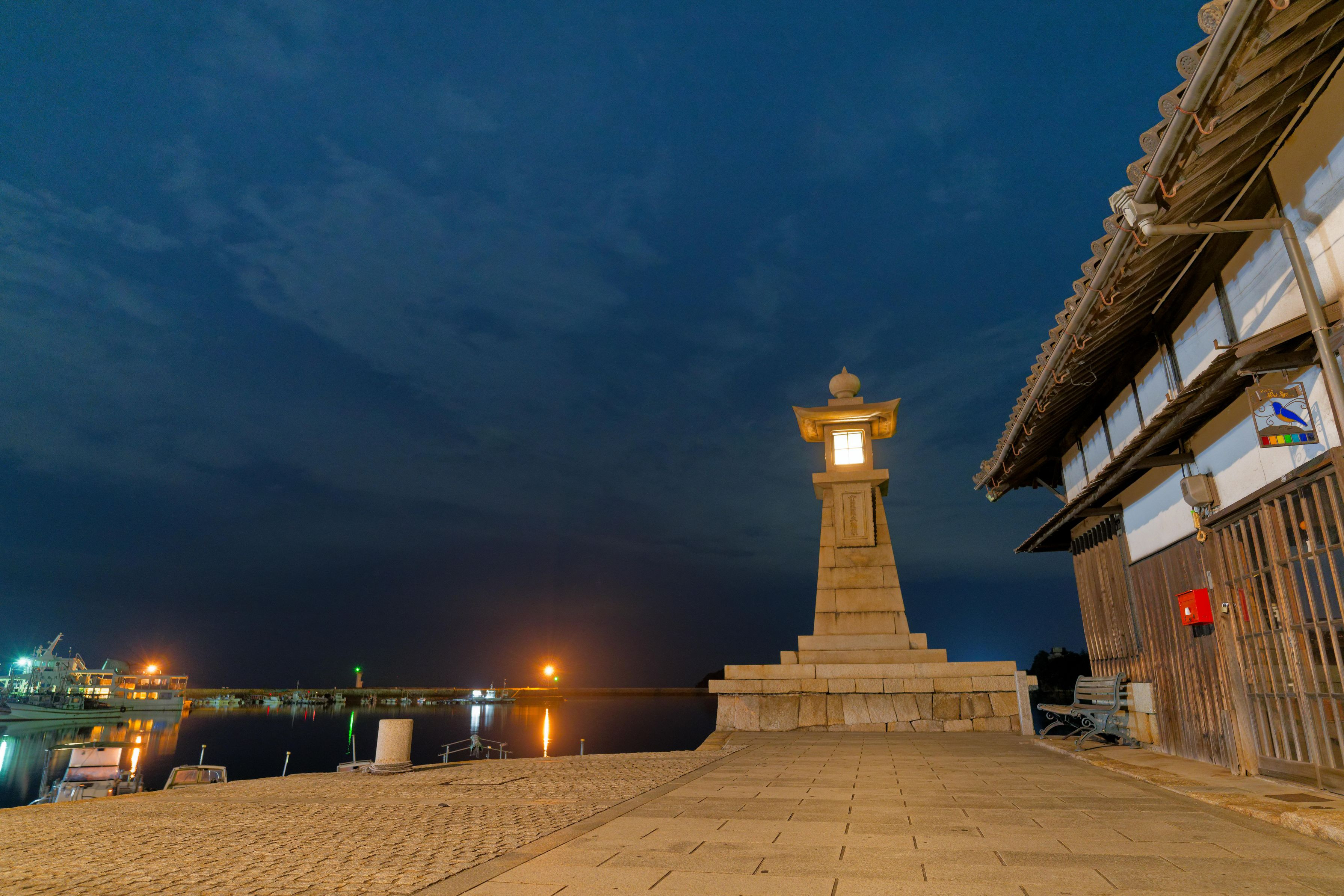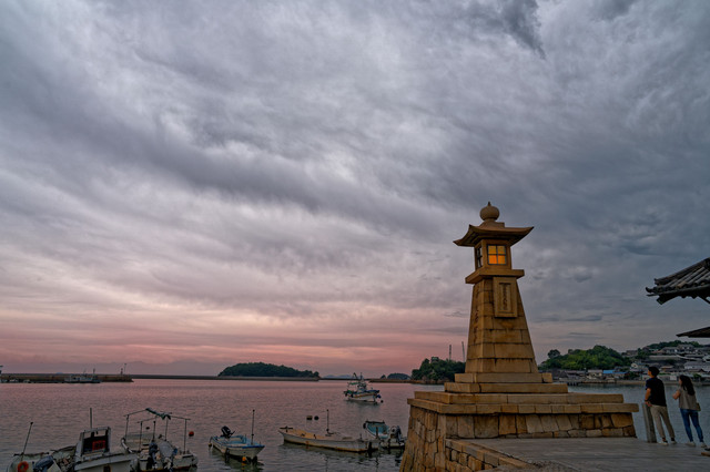 鞆の浦の「常夜燈」は安政6年 (1859) に建造され、小さな灯台として港町を見守り続けるシンボル的存在。映画のロケ地やアニメの背景モデルとしてよく描かれている。現存する江戸時代の常夜燈としては日本最大級の高さ。 (るるぶWebより引用)