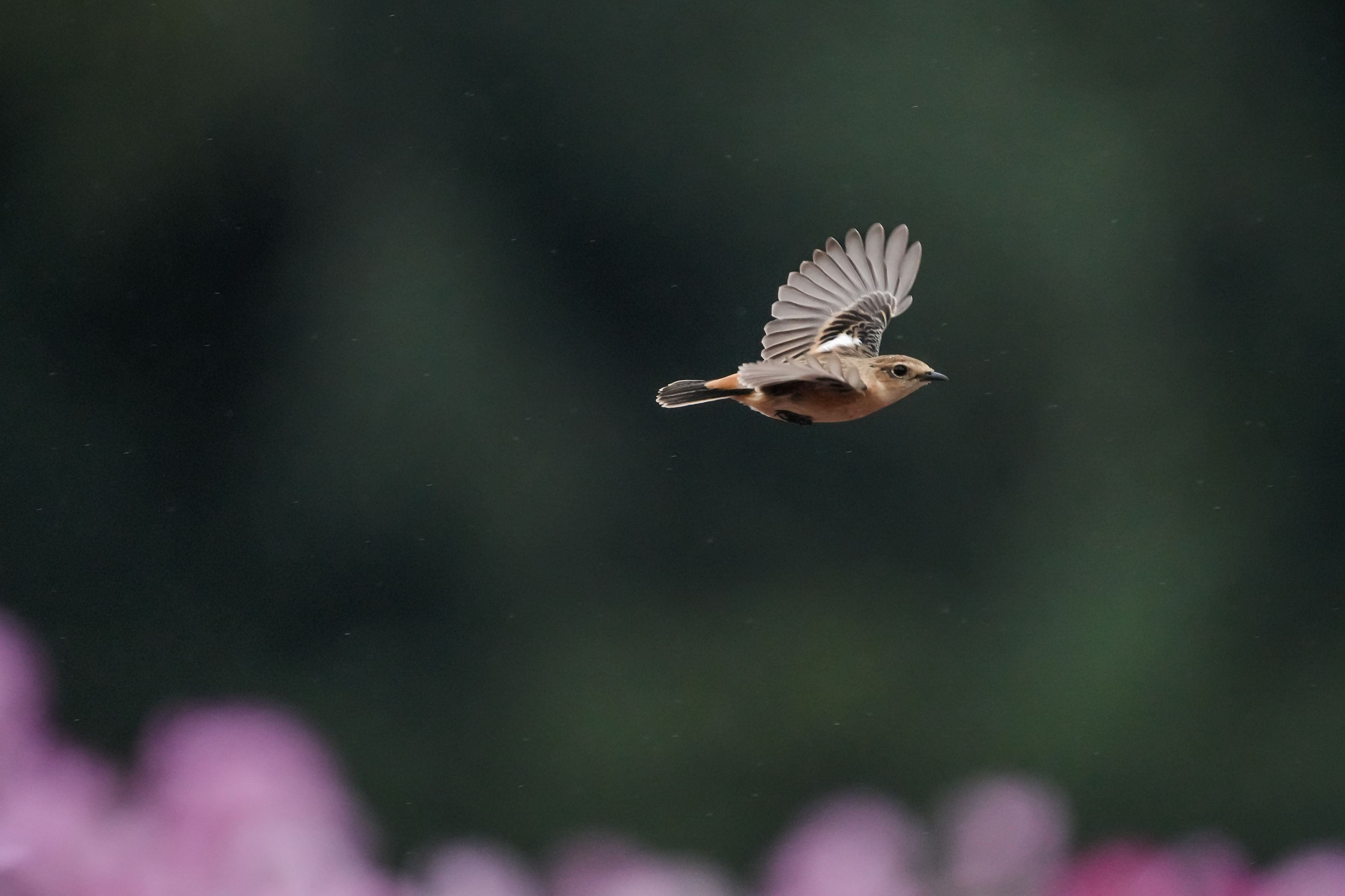 小雨の中コスモスの上を飛翔するノビタキ