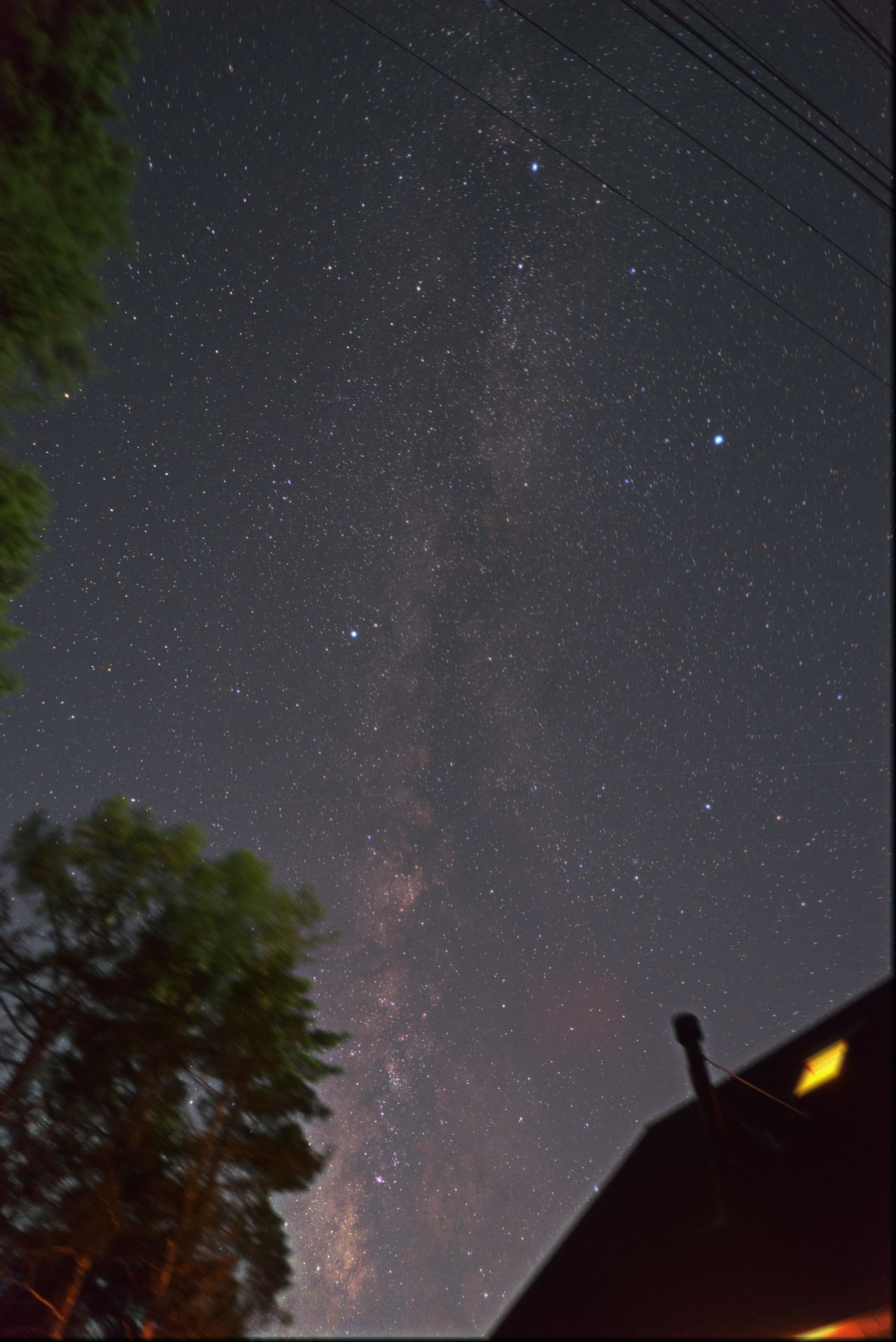 天の川を木と屋根の隙間に入れて撮ってみた写真です。天の川がもう少し右でもいいかも知れませんね。残念ながらSWAN彗星はまだ低空で写らない頃です。固定撮影した10コマをアルタイルでアライメントをとって加算平均してみました。今週末こそ晴れろ~…。