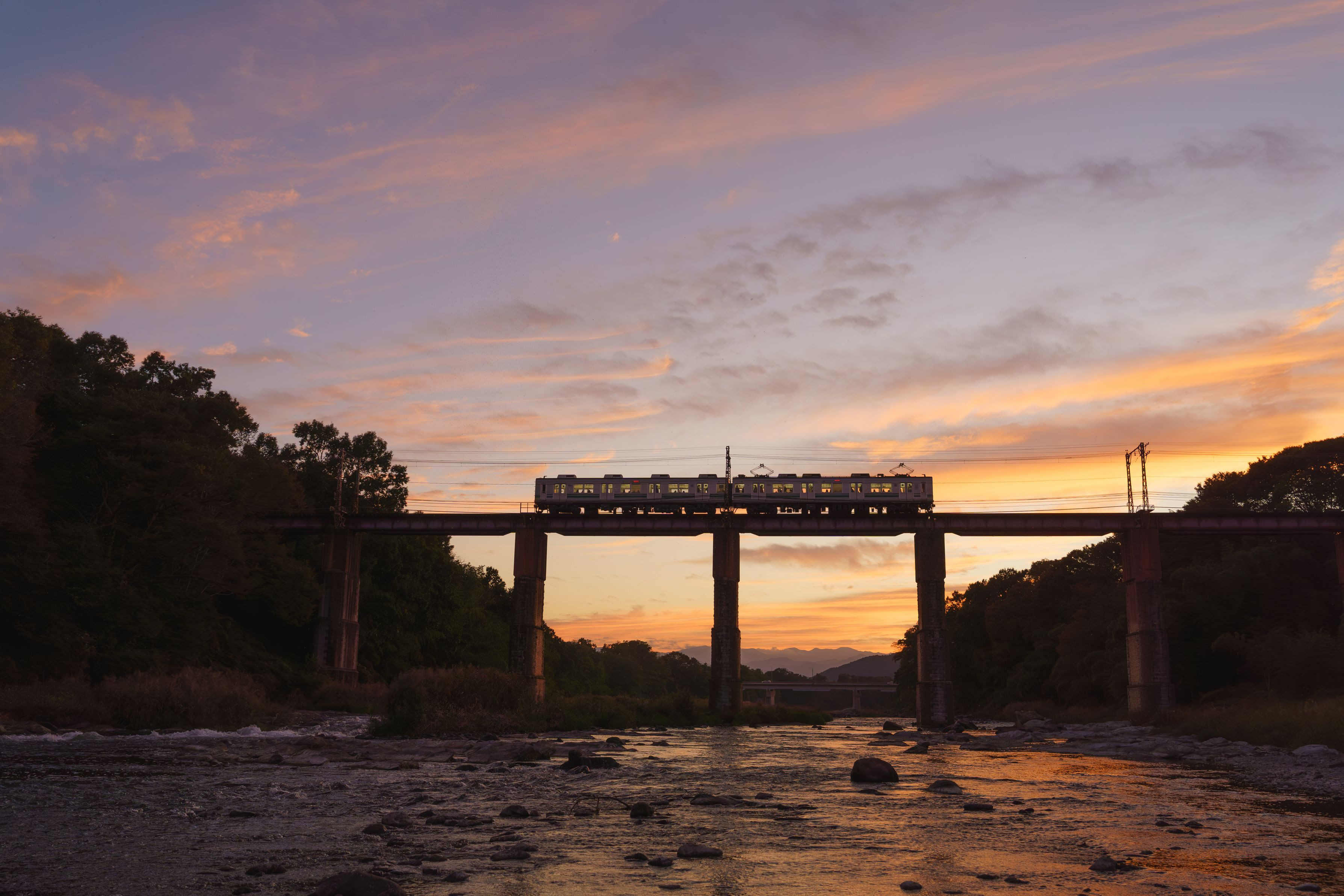 秩父鉄道 荒川橋梁にて 秋の夕空を背景にローカル列車がゆっくりと荒川を渡っていきます。