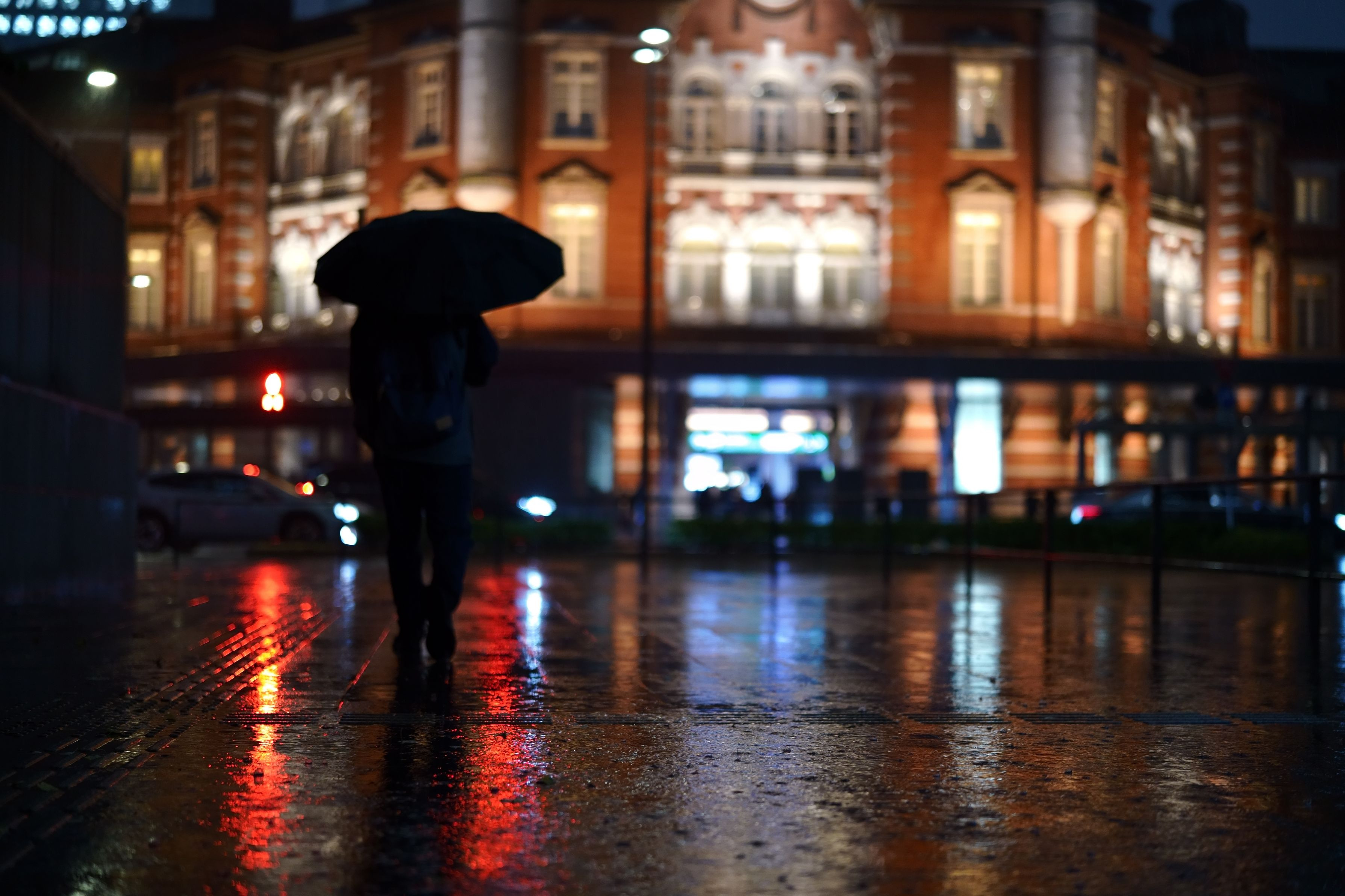 金曜日の夜の帰宅中に東京駅前、雨の中、少し寄り道して会社帰りのサラリーマンさんが入ったタイミングでパシャリ
