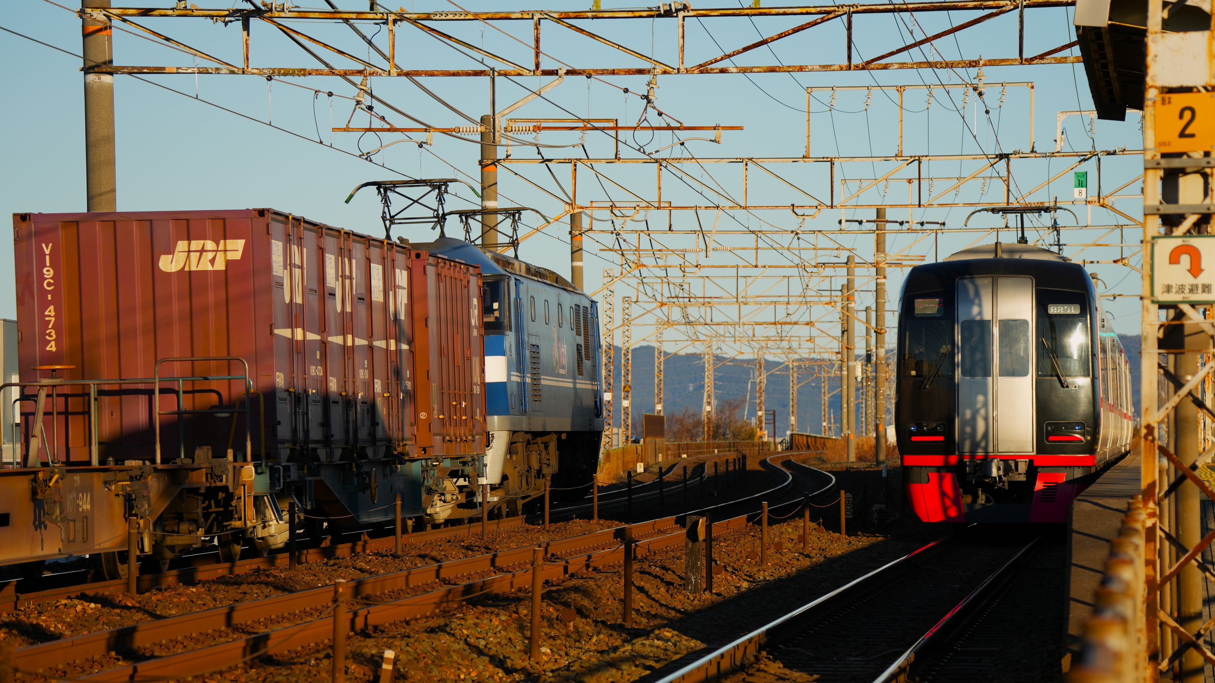 船町駅で冬に撮影したものです。この時間の貨物列車を撮影しようとすると必ず駅から出てきたミュースカイに追い抜かれて一瞬貨物列車が見えなくなってしまいます。