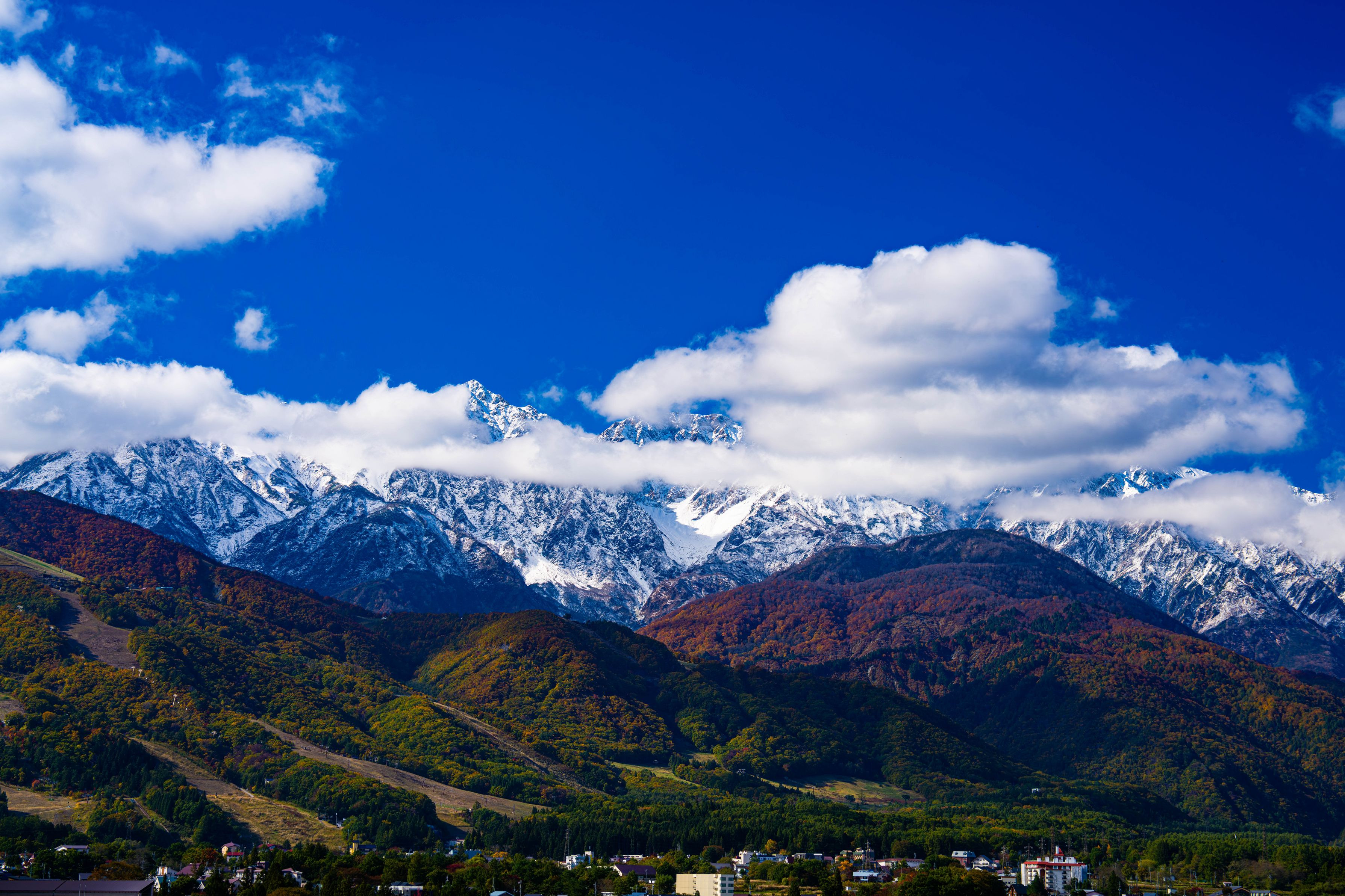 初冠雪の報を聞いて白馬村へ 微かに見える白馬槍ヶ岳の山頂 雲によって見え隠れする山の頂もまた味わい深い