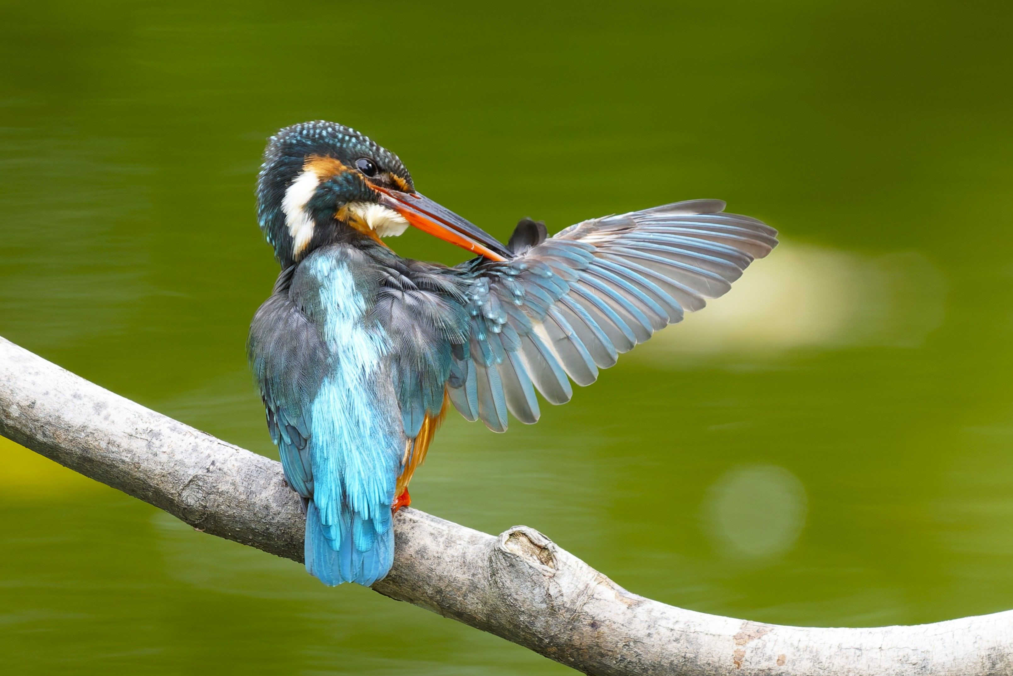 カワセミが水浴びをした後の 羽繕いをする場面をパシャリ!!