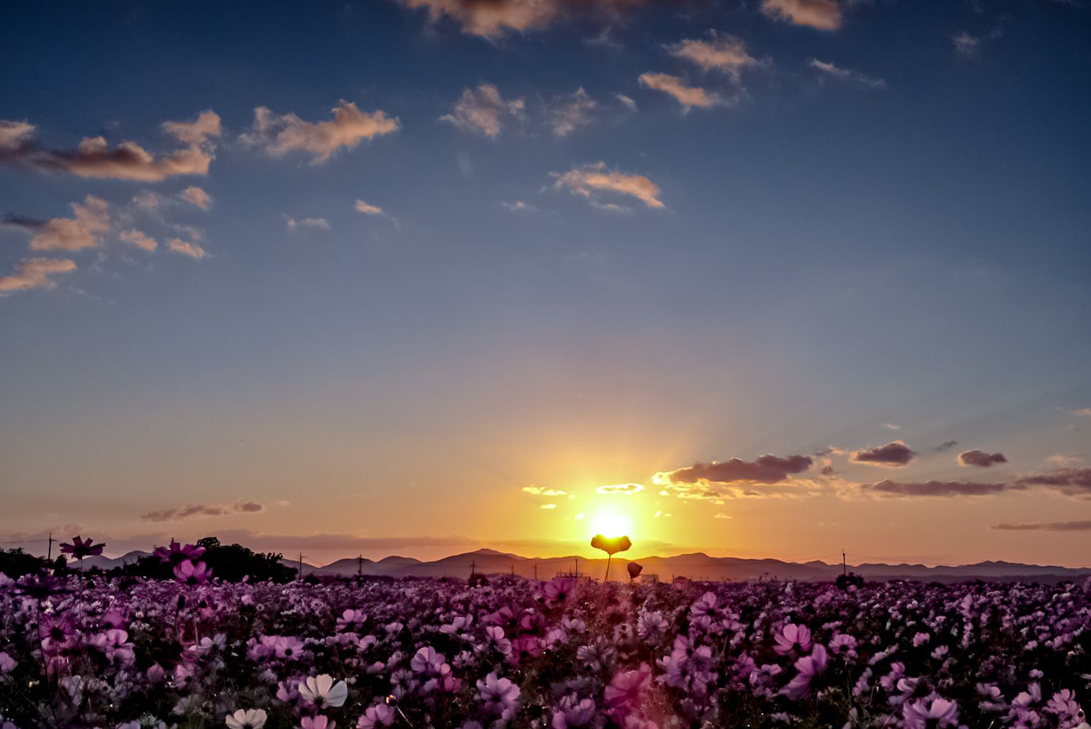 コスモス畑の中で一輪の花が陽を受け止めているような感じ。 長い1日が終わろうとしている。