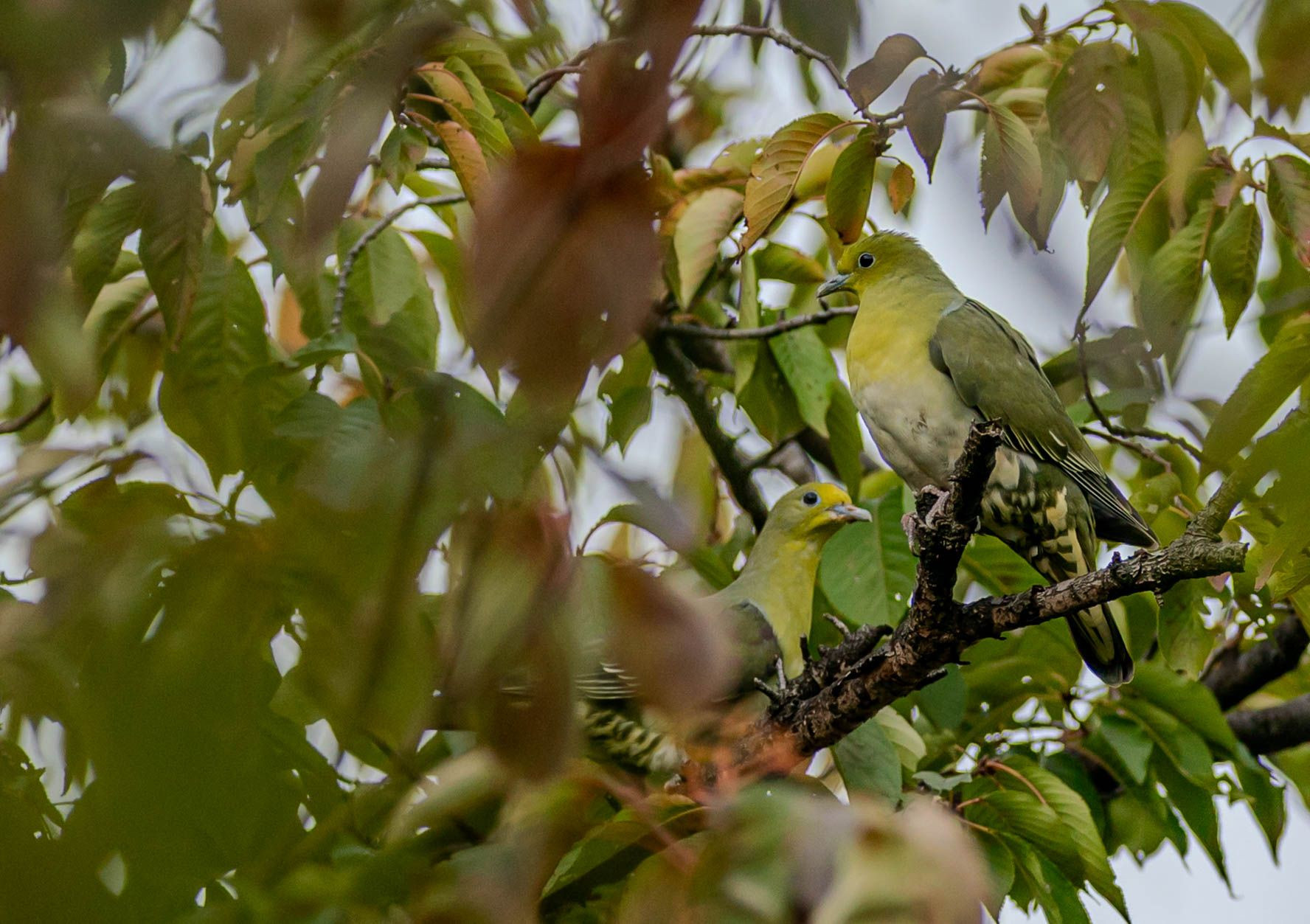 山の鳩、アオバトが平地に降りてきていた。 少し大きめな鳥が飛来し、そして茂みに着地したのが見えた。 姿を確認しようとするが、落葉もまだ、細かな小枝も多く、枝葉の隙間を探した。 ここしかないと言ってもいい程の僅かな隙間から懸命に探すと雌が見えた。 シャッターを切っていると雄が突っ込んできた。