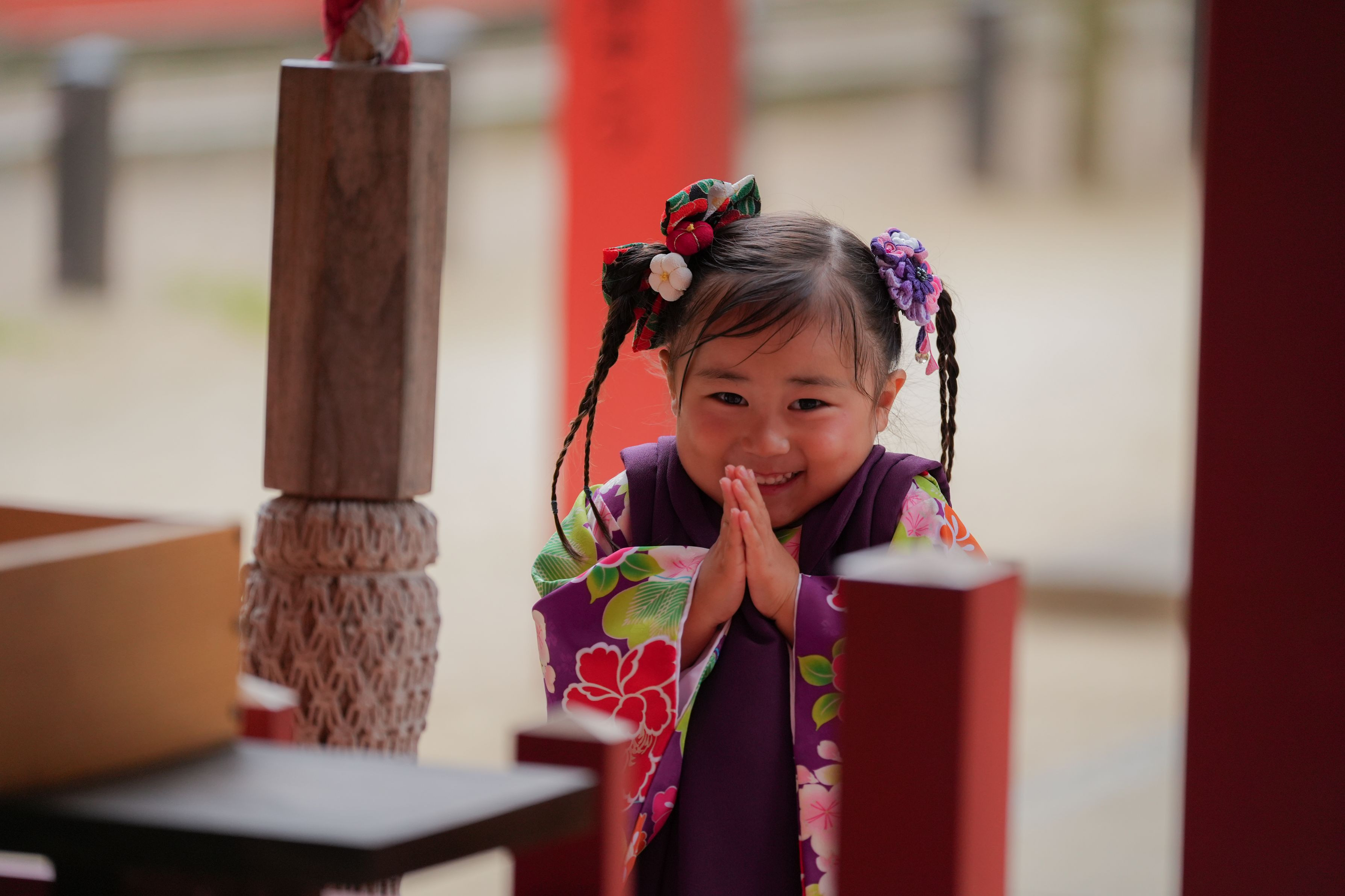 七五三のお参りの日。 少し緊張しながらも、覚えたての「パンパン、ぺこり」も上手にできていました。 手を合わせた瞬間の、この笑顔。 お願いごとよりも、ちょっぴり恥ずかしさが顔に滲み出ていました。