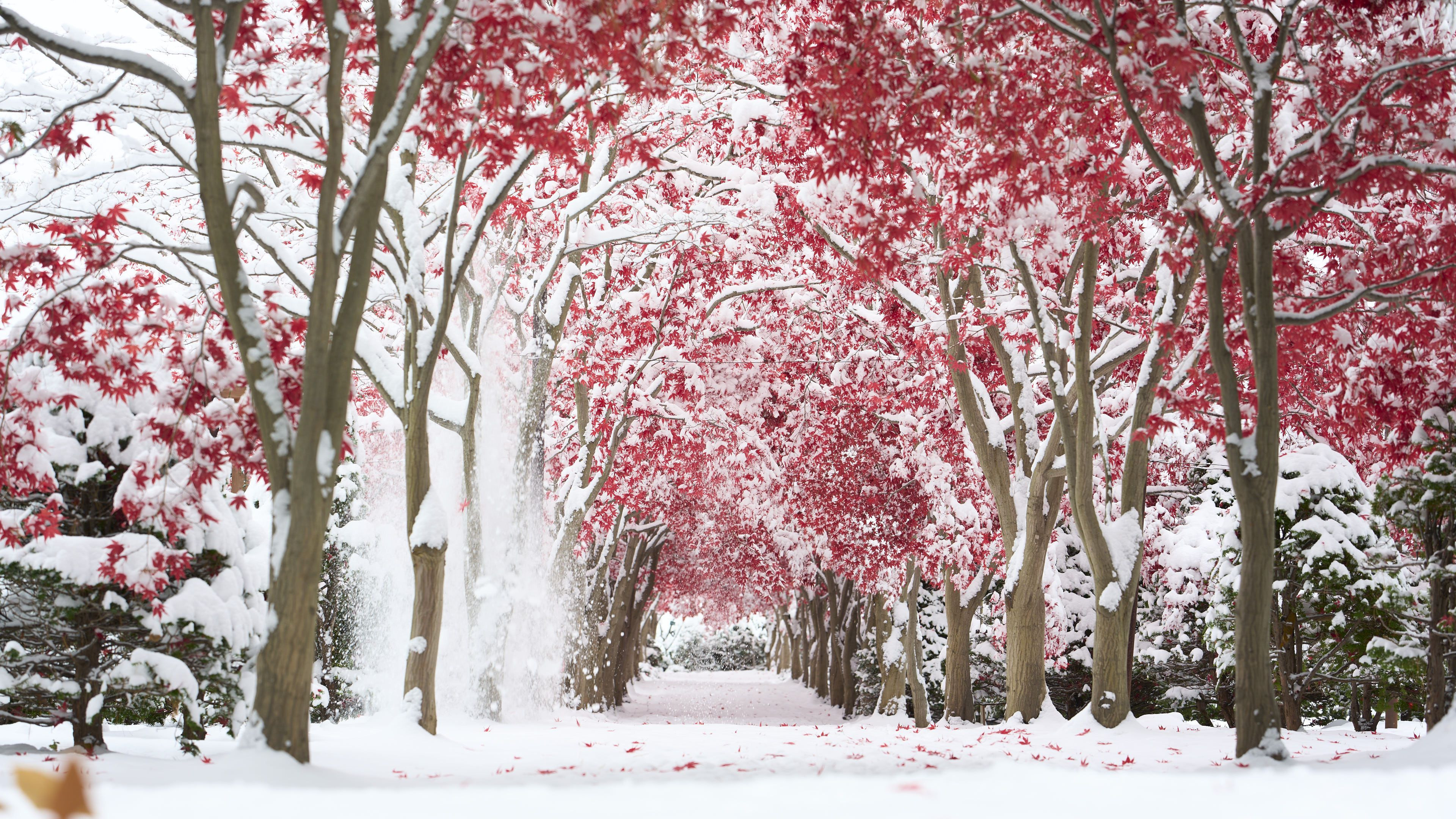 札幌市平岡樹芸センターの「紅葉のトンネル」に新雪が積もりました。左の木から、雪が滑り落ちる瞬間です。