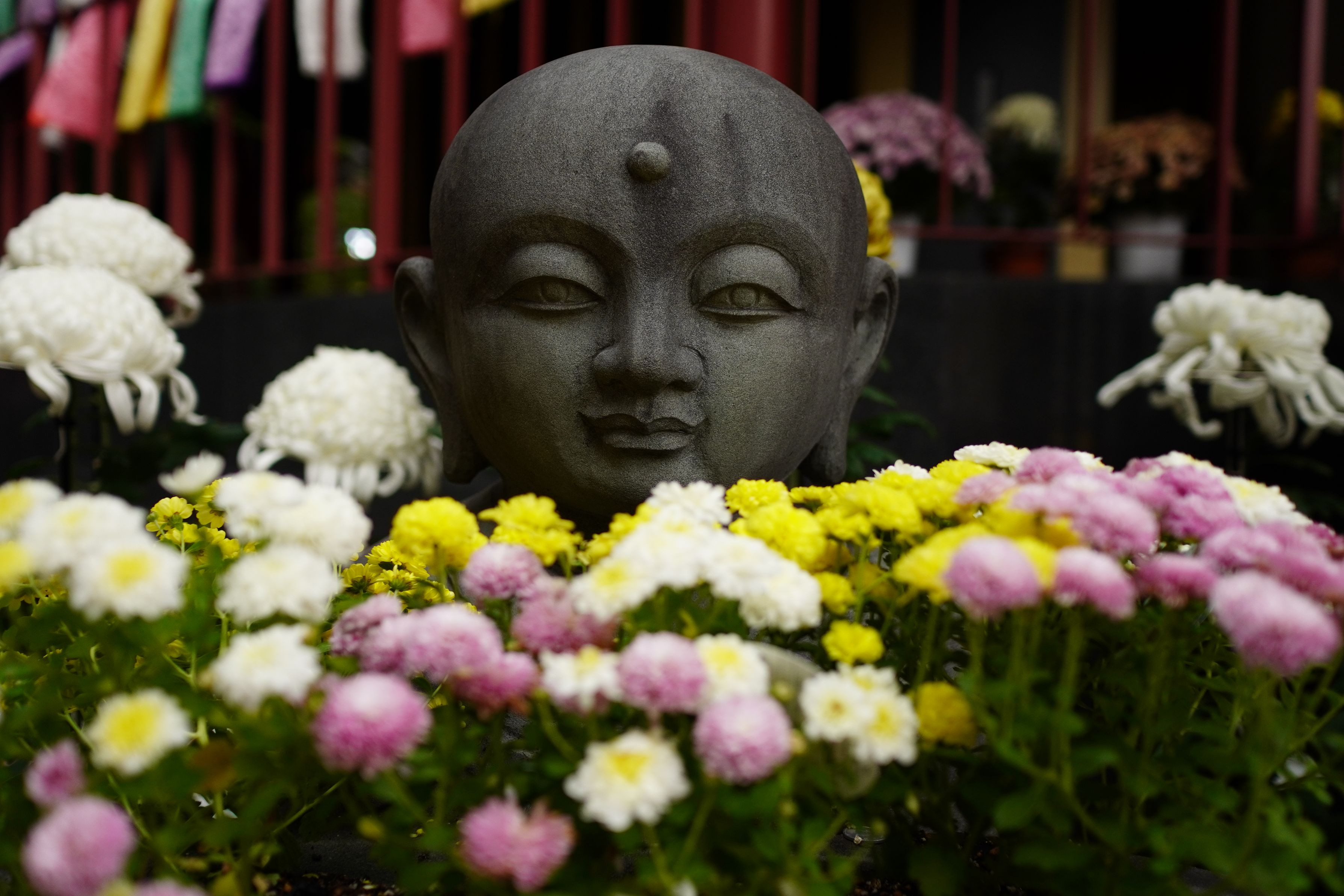 満開の菊の花の向こうにひょっこりとお顔が