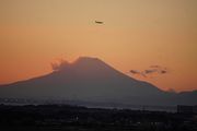 公園の夕暮れ時のカワセミと富士山