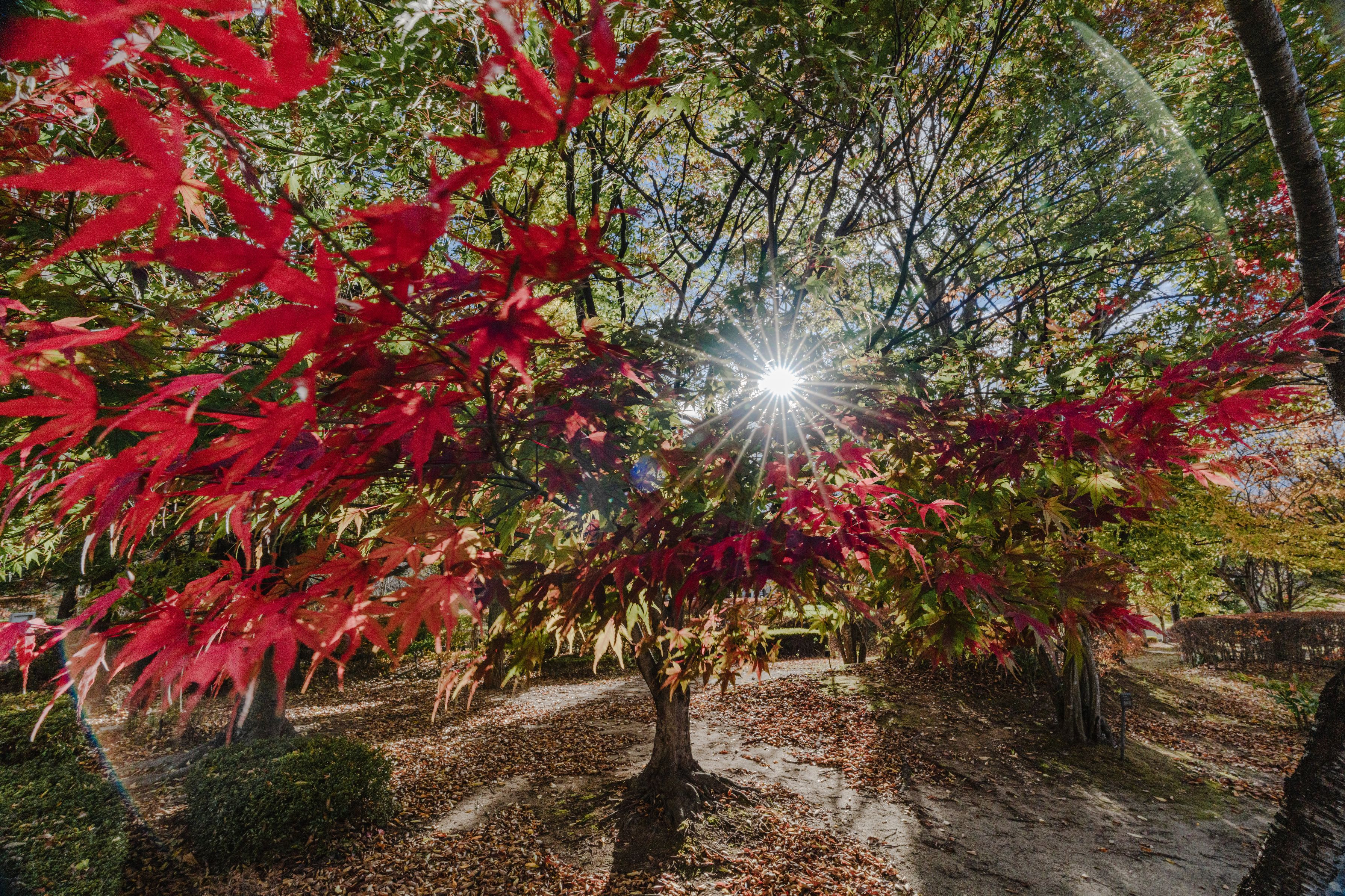 紅葉が進む木をアクセントにトゲトゲしたお日様も入れて、広角で撮りました。