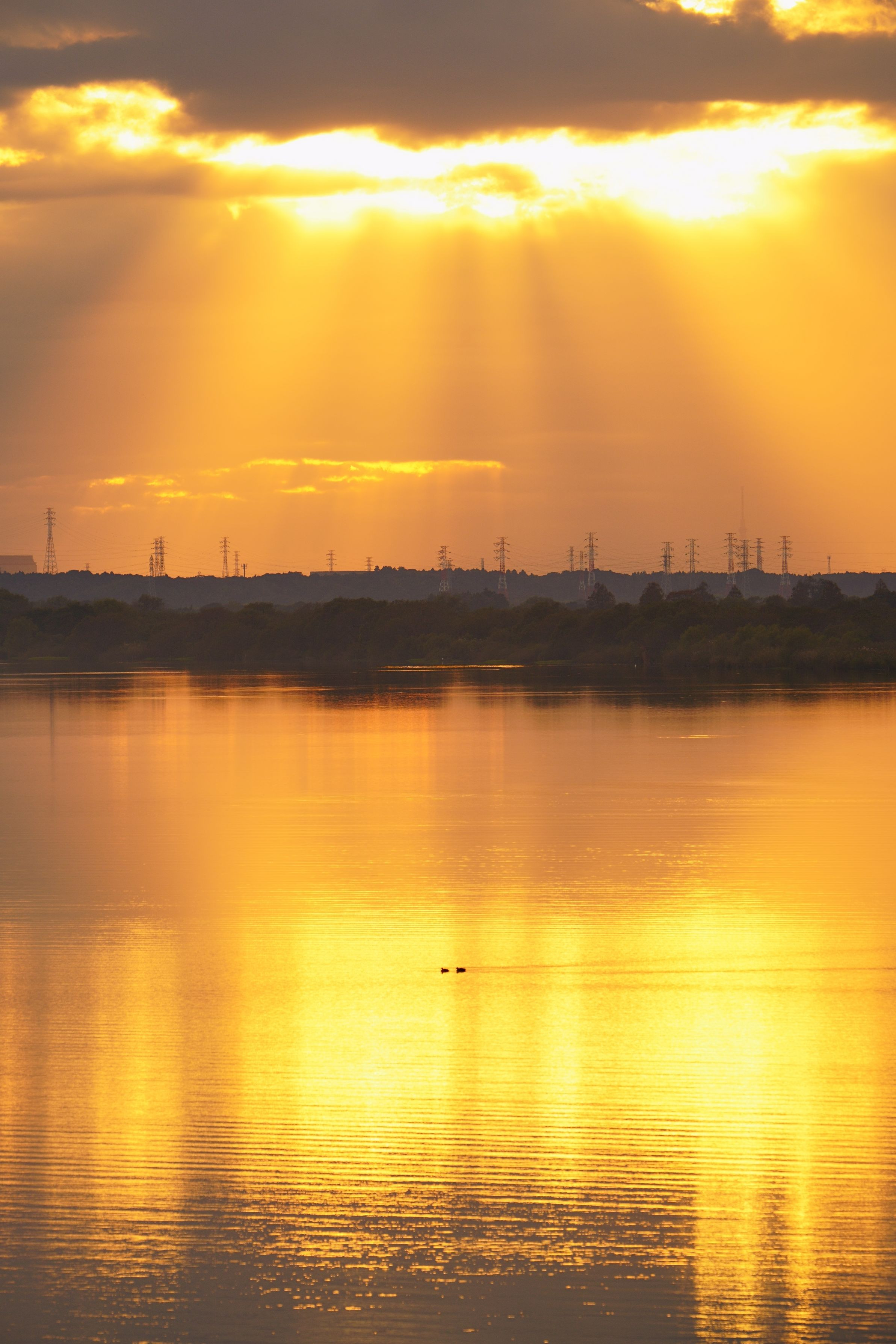 千葉県と茨城県の県境を流れる利根川。長豊橋付近は大きな湖のようです。 この先に落陽富士が見えるはずでしたが、あいにくの雲に阻まれ見えず。 代わりに壮大な光芒が見えました。