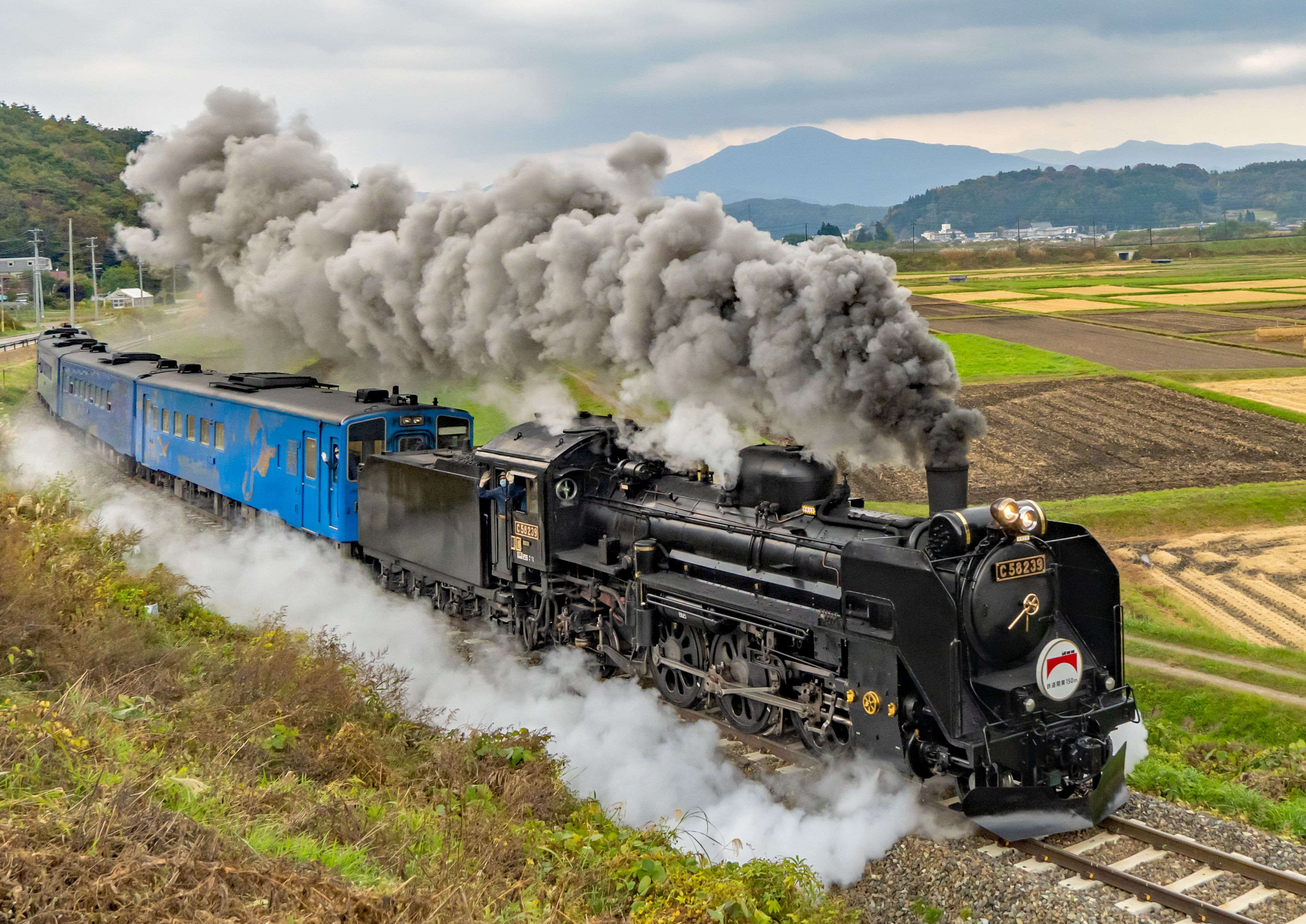 3年前からの蔵出しです。2022年10月は、我が国の鉄道150周年でした。SL銀河も、150周年ロゴをあしらった特別のヘッドマークを装着して走行。この日のSL銀河は、痺れる爆煙で来てくれました。道の駅「風の丘」の側道から撮影。