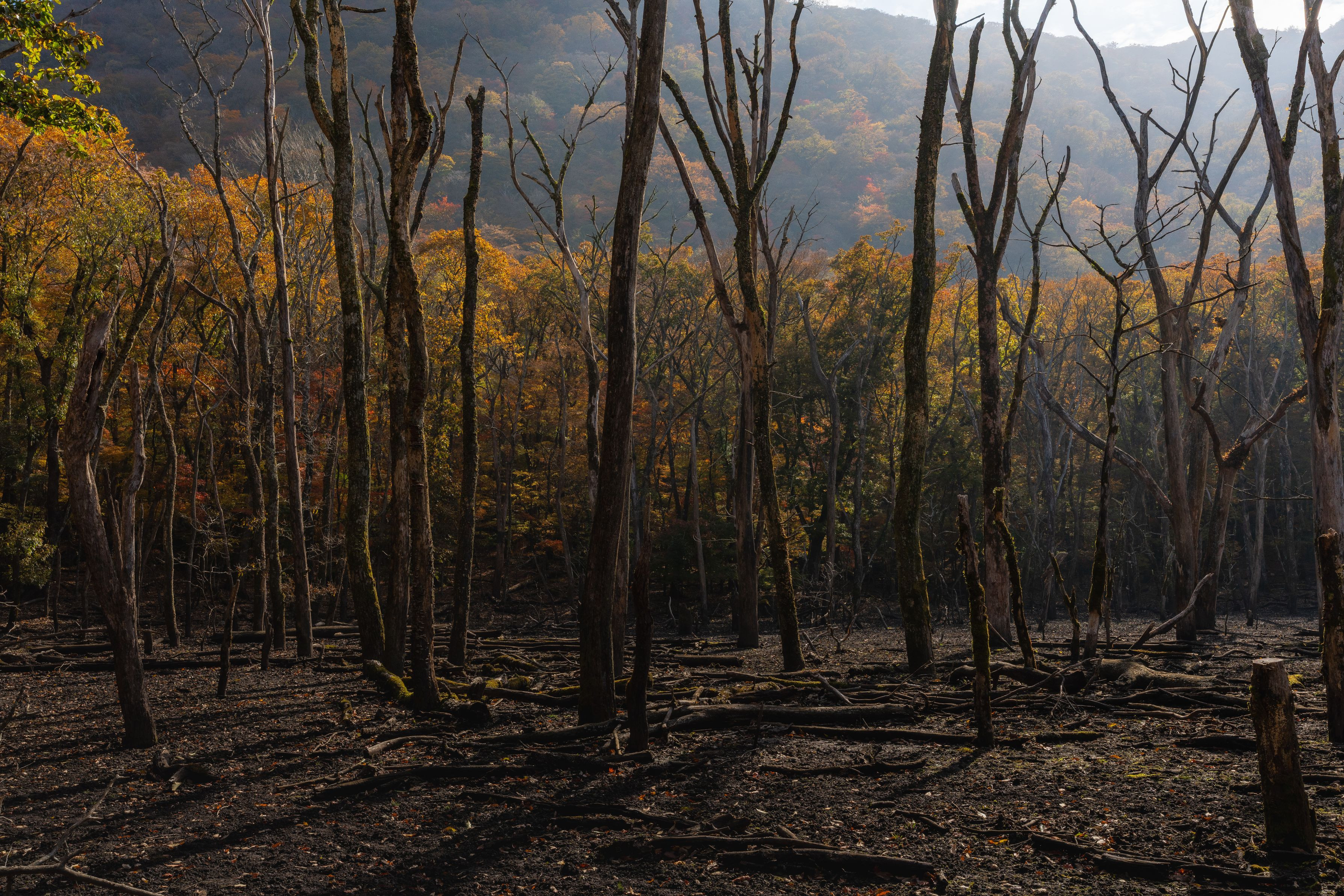大分県男池周辺、、手前の木々は枯れ果て十数メートル先は森林が広がる不思議な場所だ。