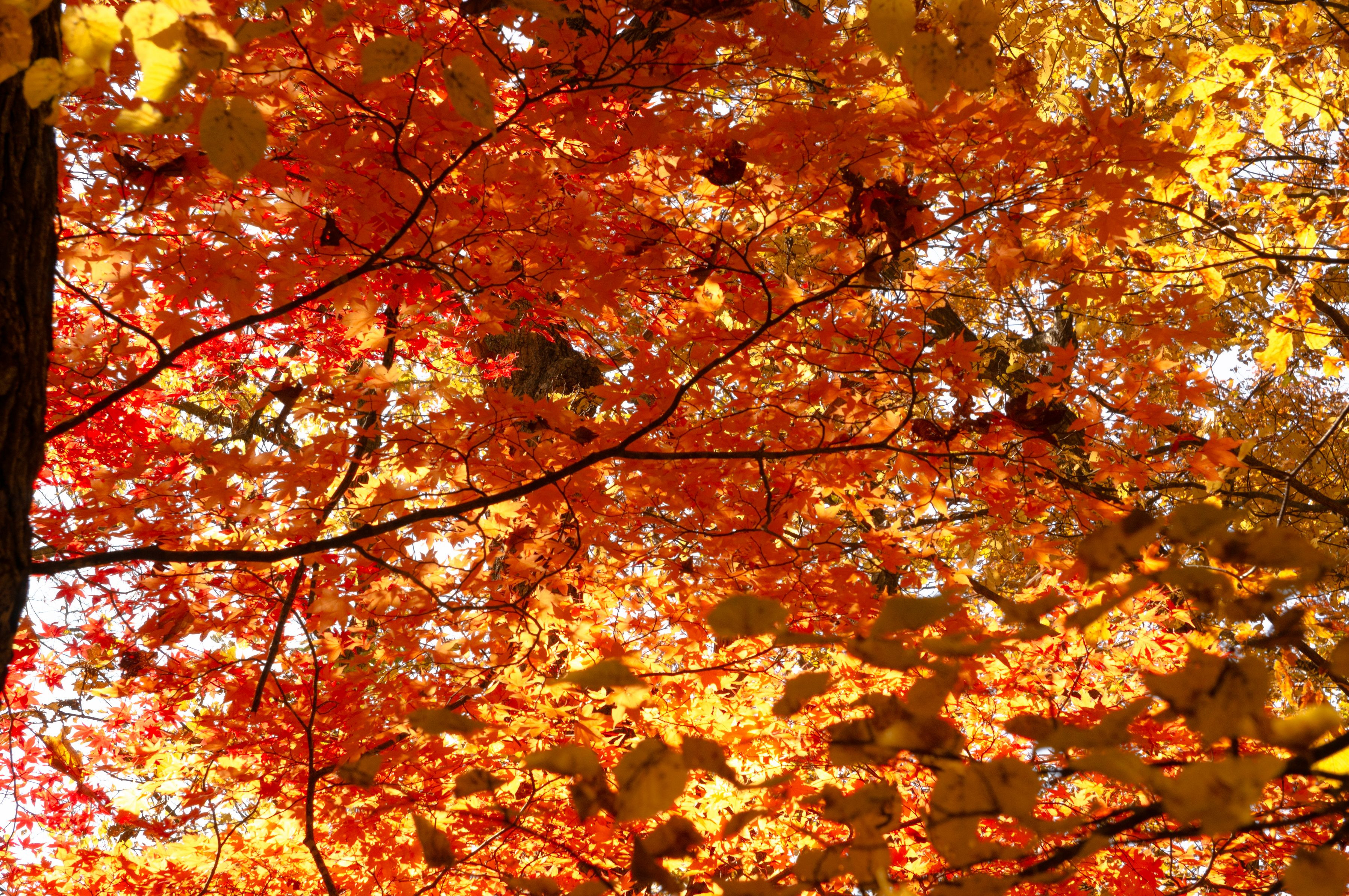 コゲラの影を見つけて追いかけて見上げるときれいな紅葉の天井が見えました。