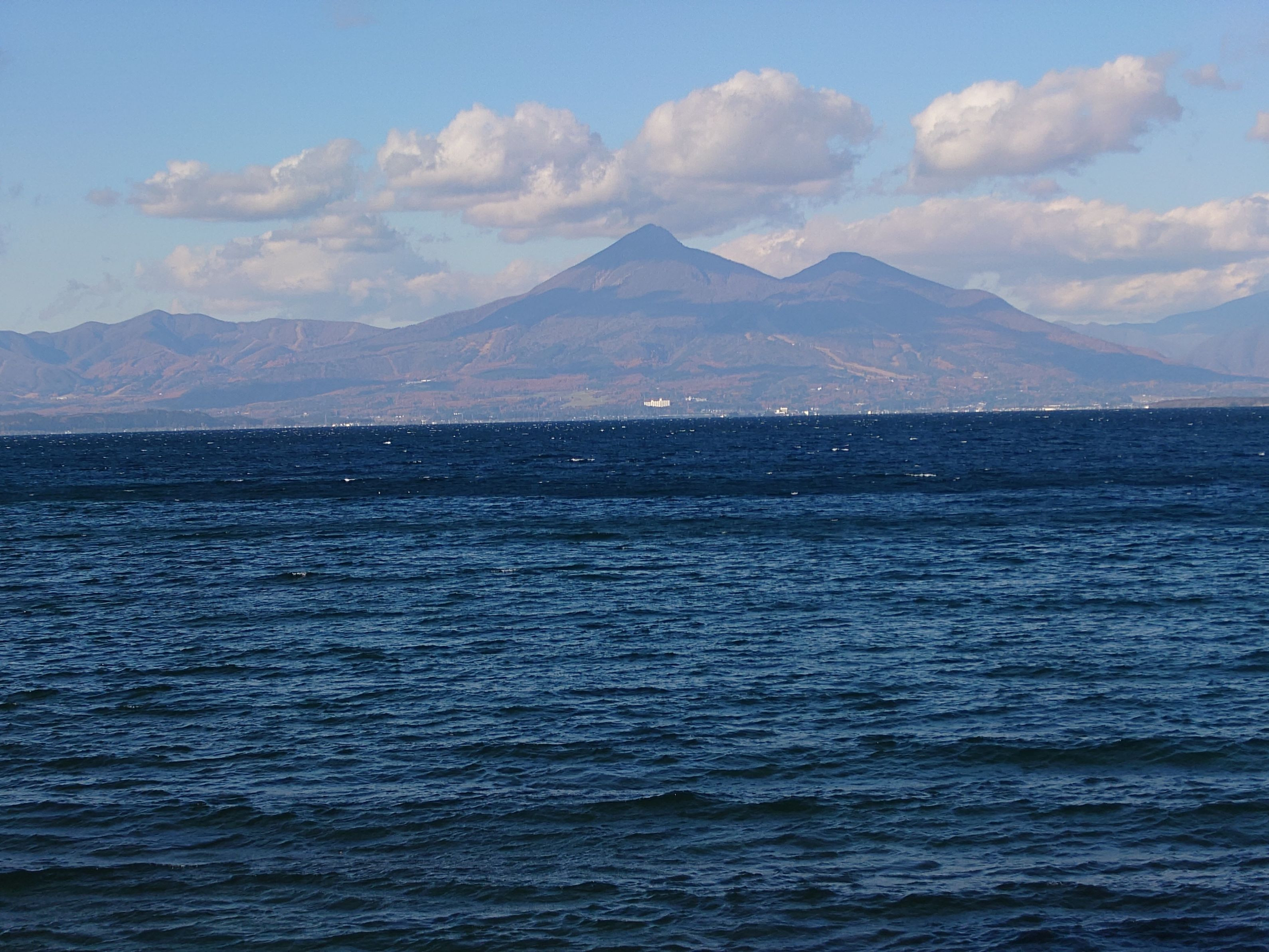 晴れ間に雲がたなびき、赤く紅葉した木々が見える磐梯山です。七五三の日ですね。 風が強く波がうねっています。