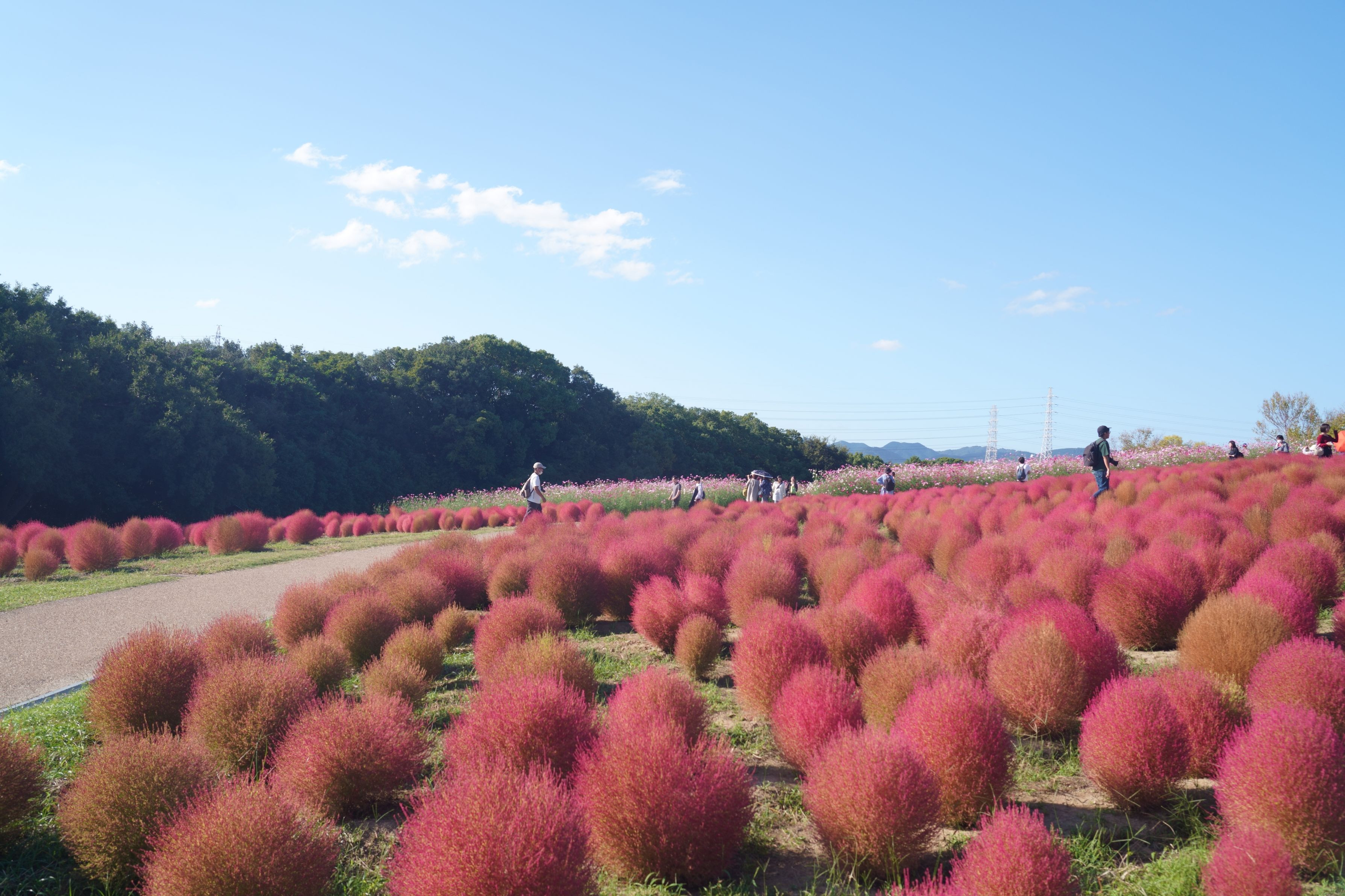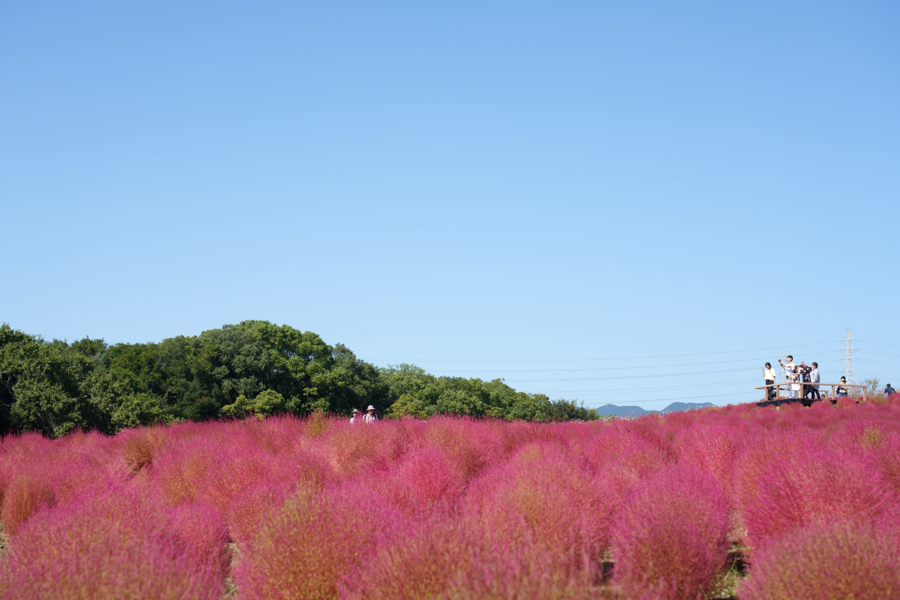 展望テラスは写真を撮る人でひっきりなしですが、ここからだと逆光のなか下り斜面のコキアを見下ろすことになって、構図が難しかったです