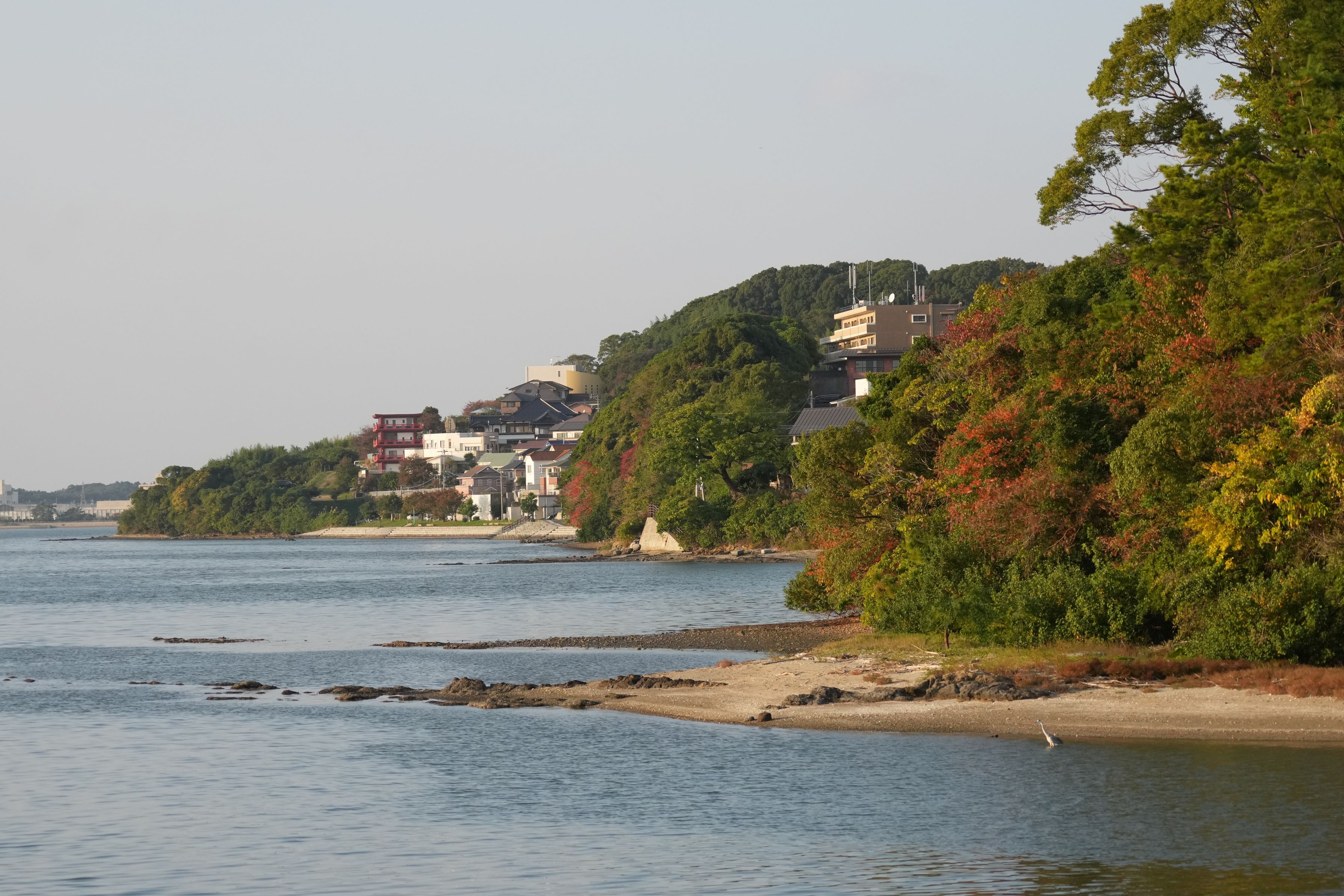 海鳥が遊びに来る海辺が色付き始めました。 アオサギちゃんが小さく見えます。