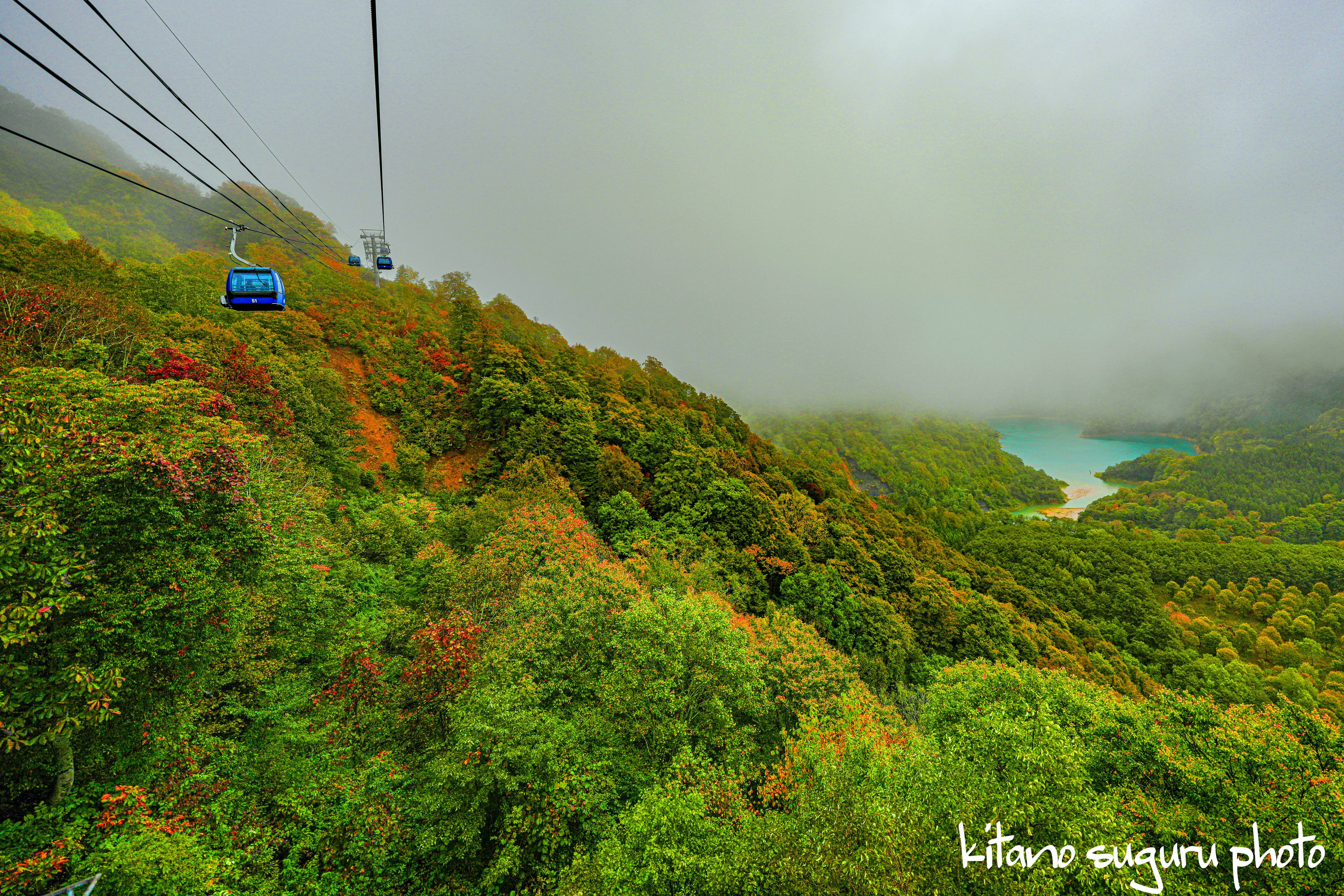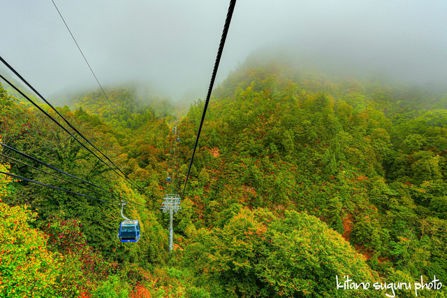 苗場ドラゴンドラは片道25分の空中散歩ですね。長さ5.5㎞です。 当日は雨降りで霧が出てて、遠くまで見れませんでしたが動く展望台でしたね。