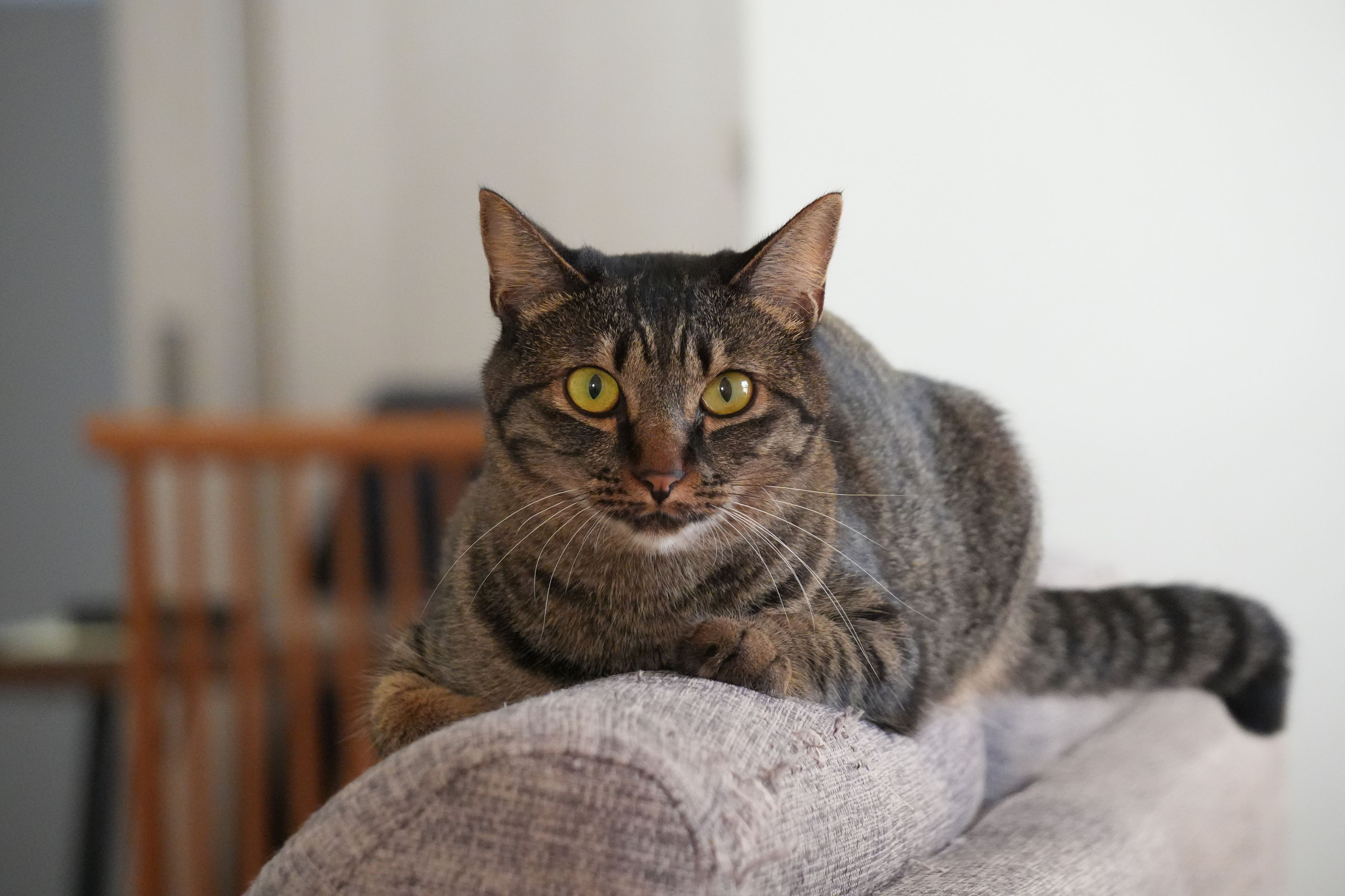 我が家の猫様 お気に入りのソファの上からこちらをじっと見つめて
