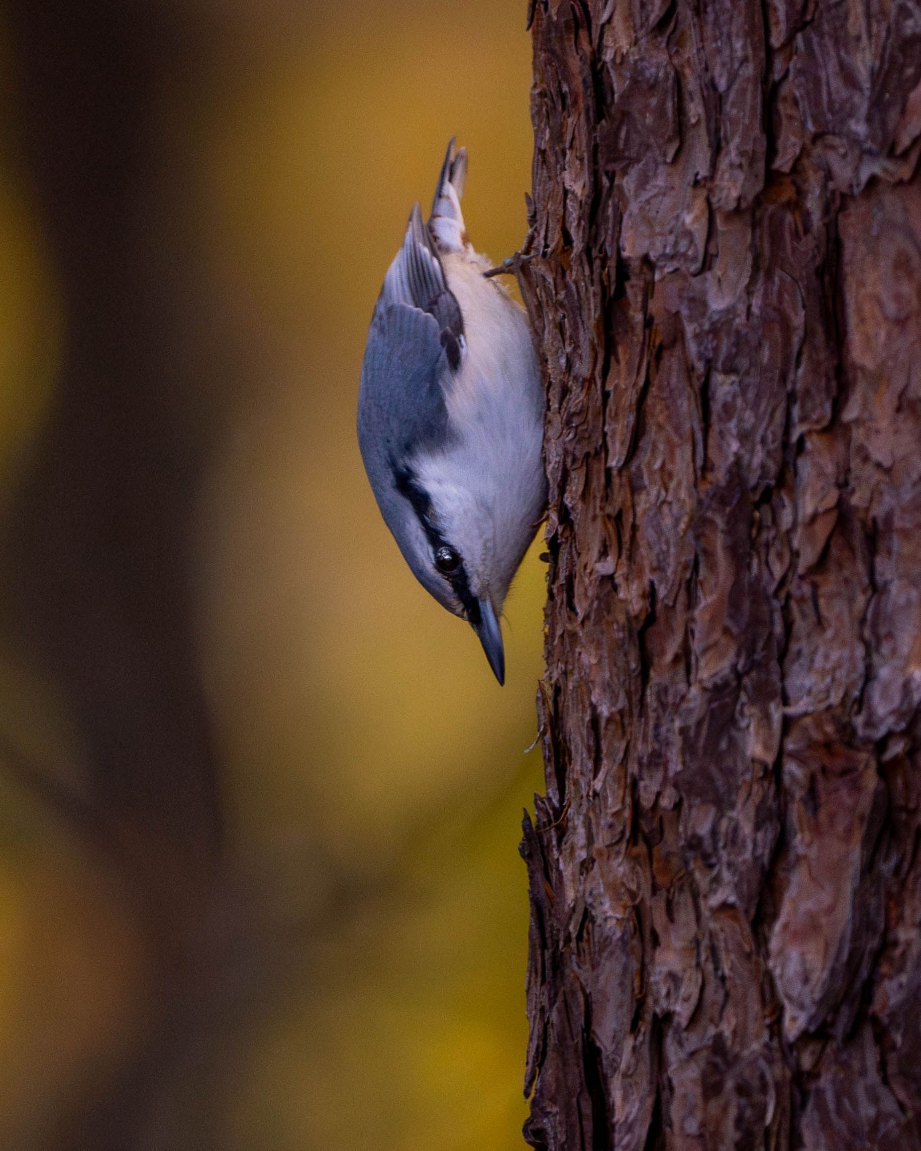 秋色の森で木の幹を下に向けて駆け降りることが出来る珍しい野鳥です。暗がりの中、何とか撮影することが出来ました。フレキシブルスポットSにして撮影しています。