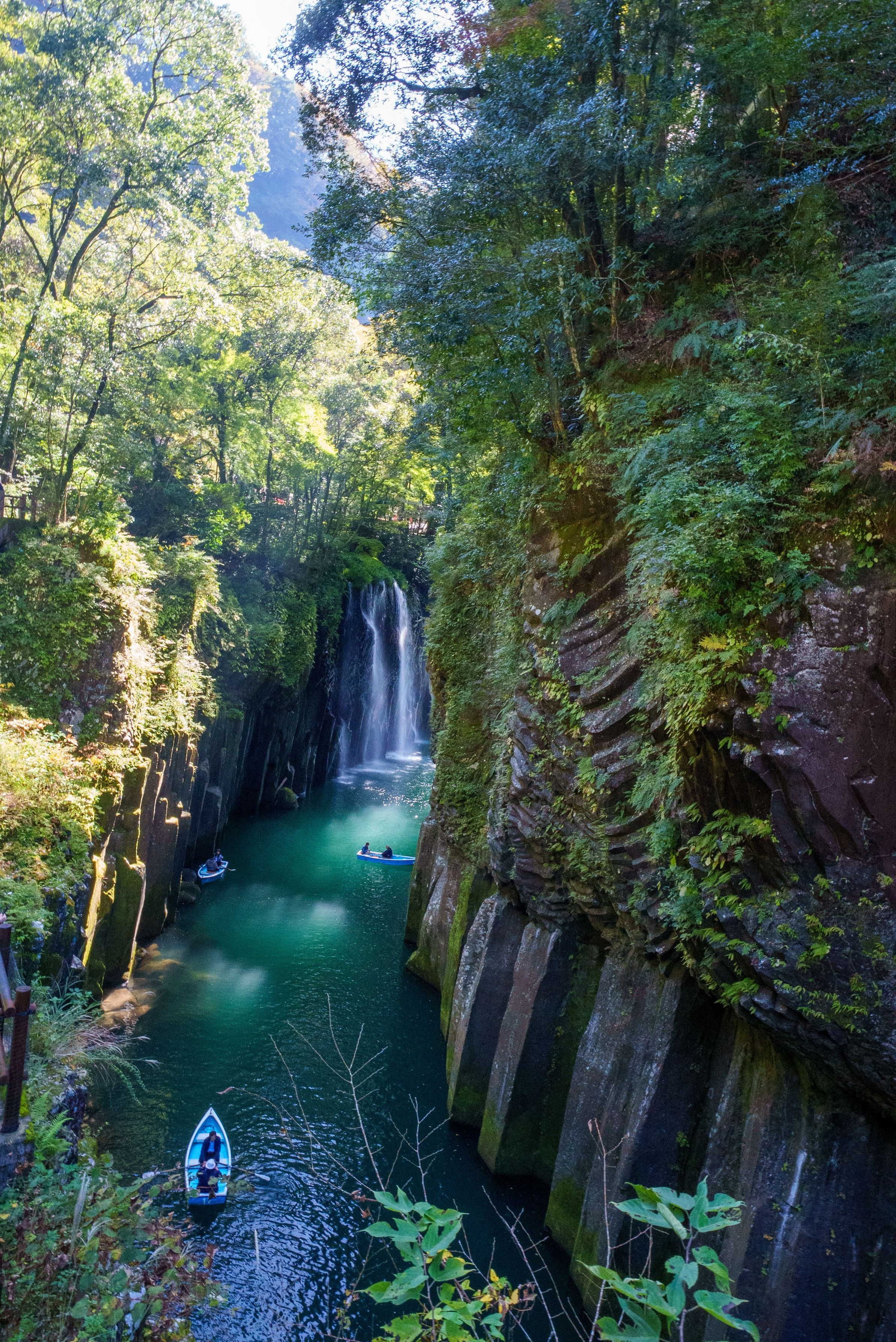宮崎県高千穂峡を撮ってみました。ちょうど光が差し込んで川の緑色が強調されていい感じに撮れました