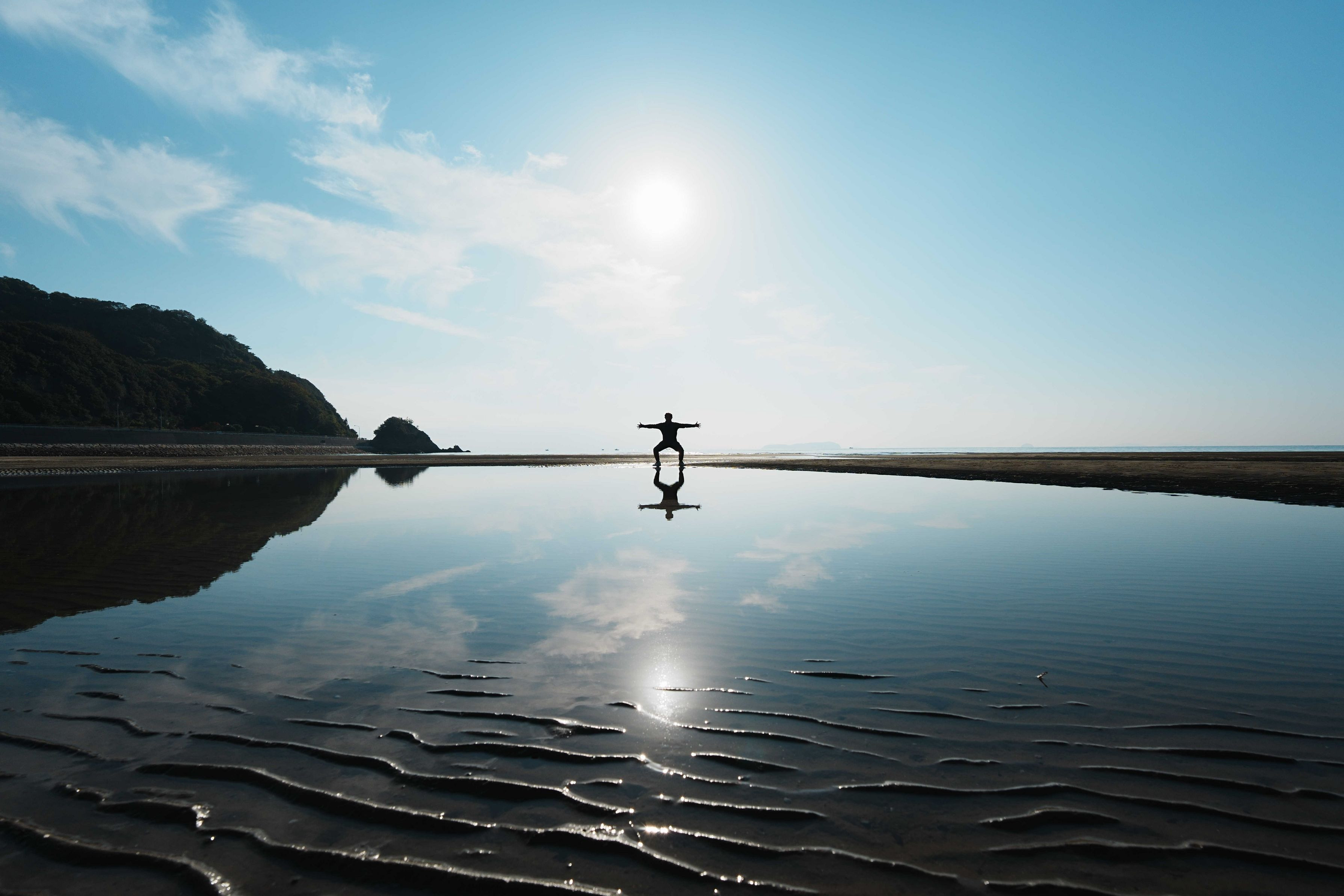 ファンの人には分かるポーズ。 ホントは4人欲しい。 父母ケ浜です。 潮が引き引きでした。