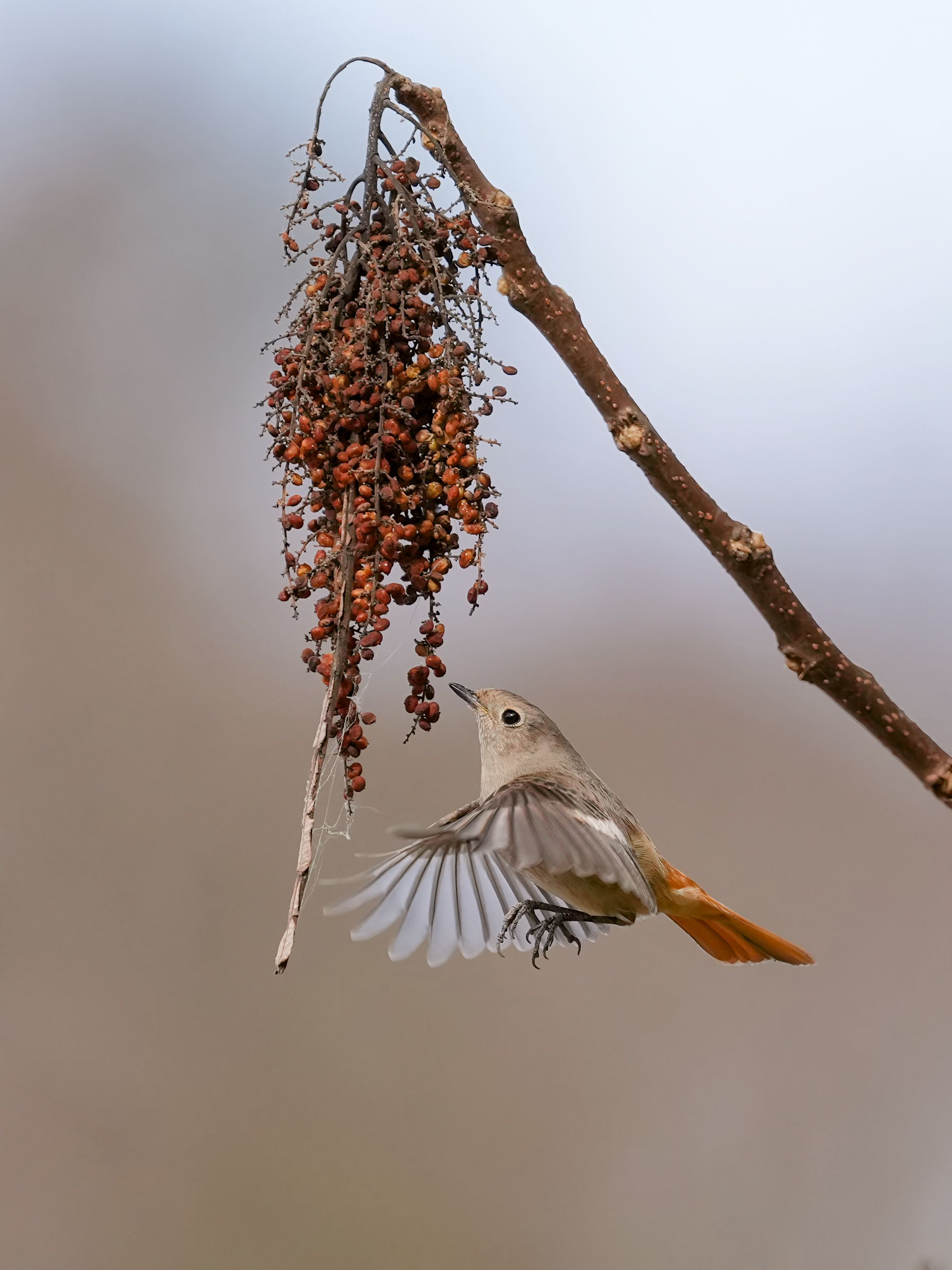 ヌルデ食堂にやって来たジョウビタキの女の子 上手にホバリングしながら食べていました。