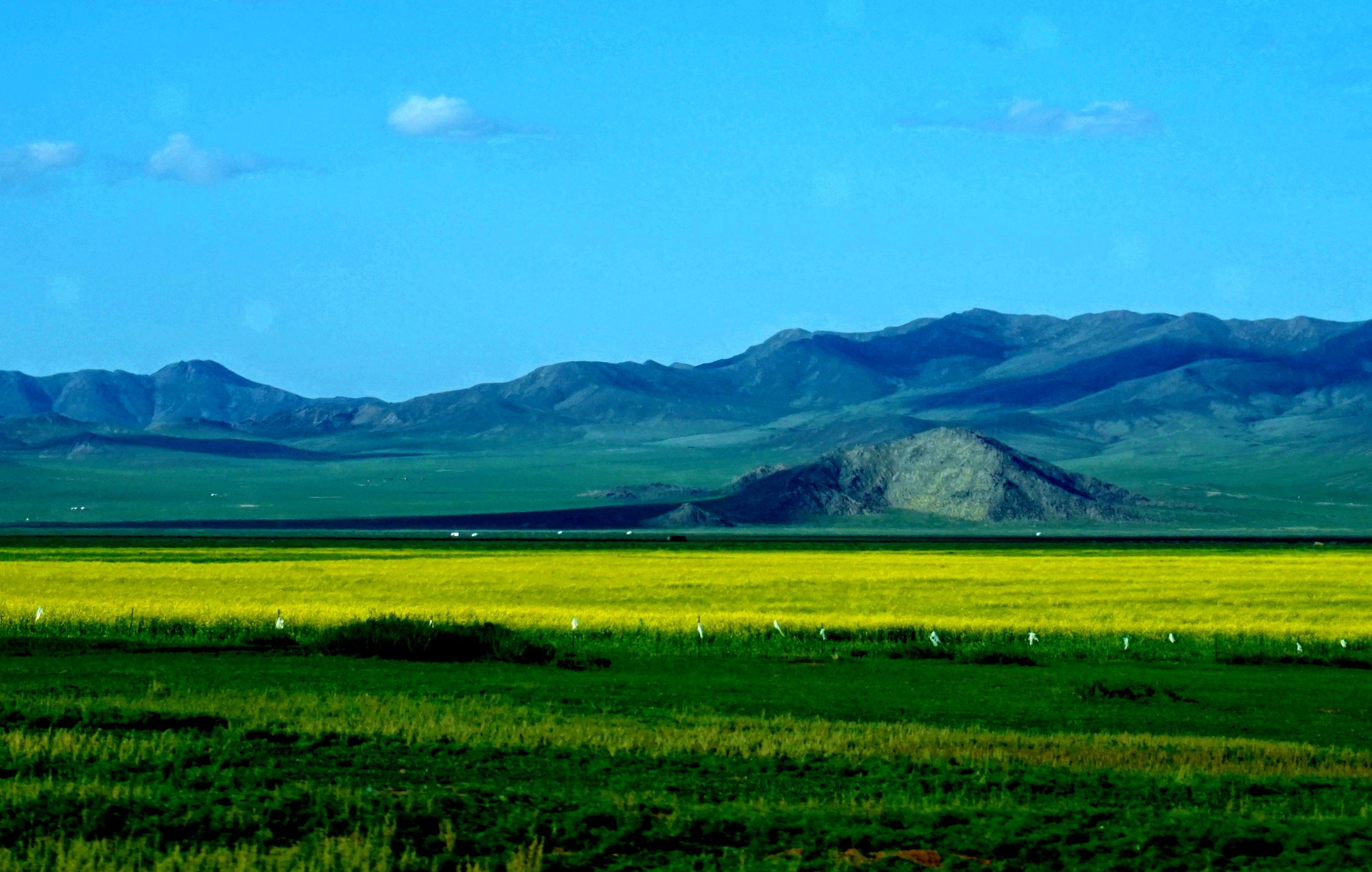 モンゴルの大草原にも黄金色の麦畑があった。走行中のバス車窓から撮りました。