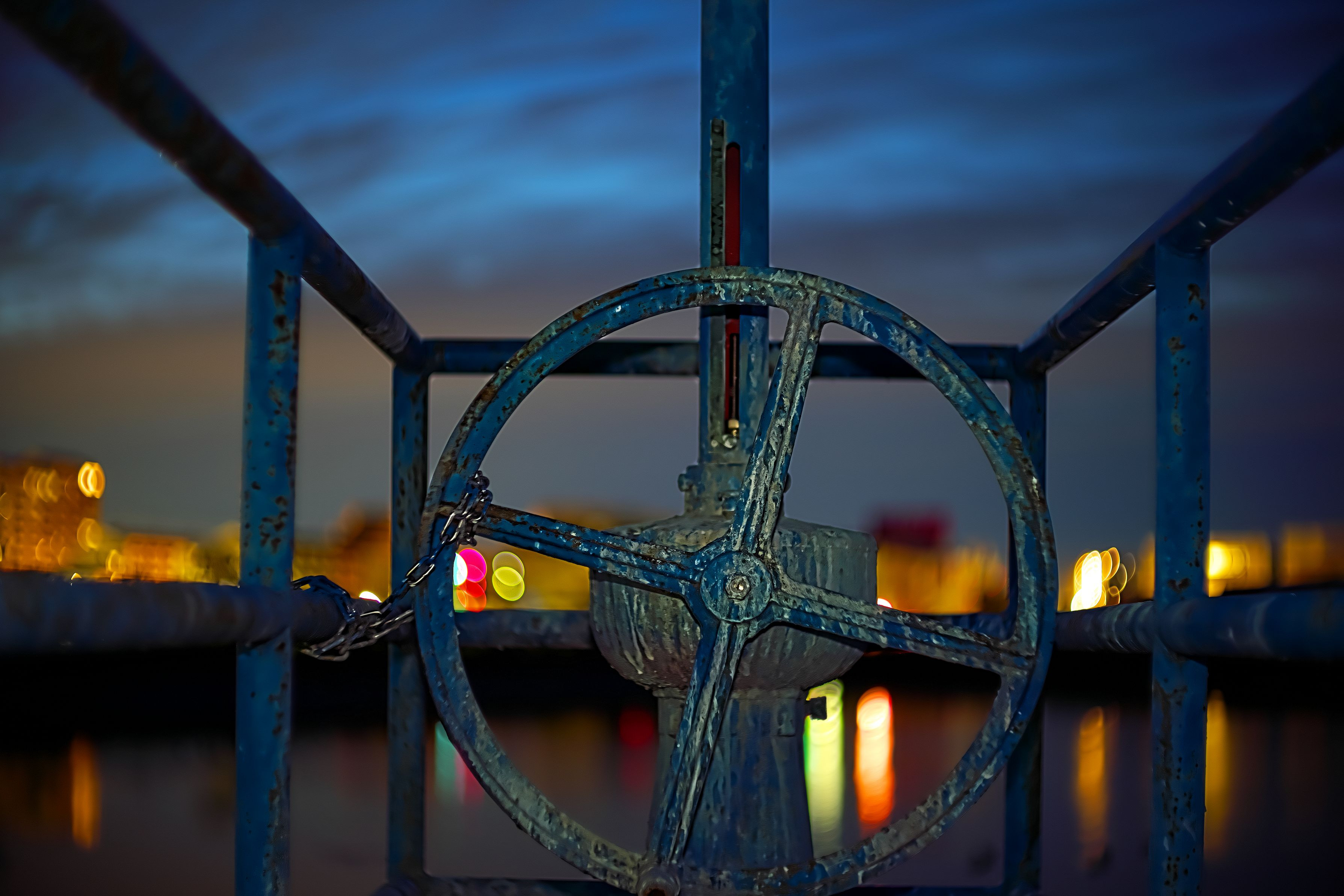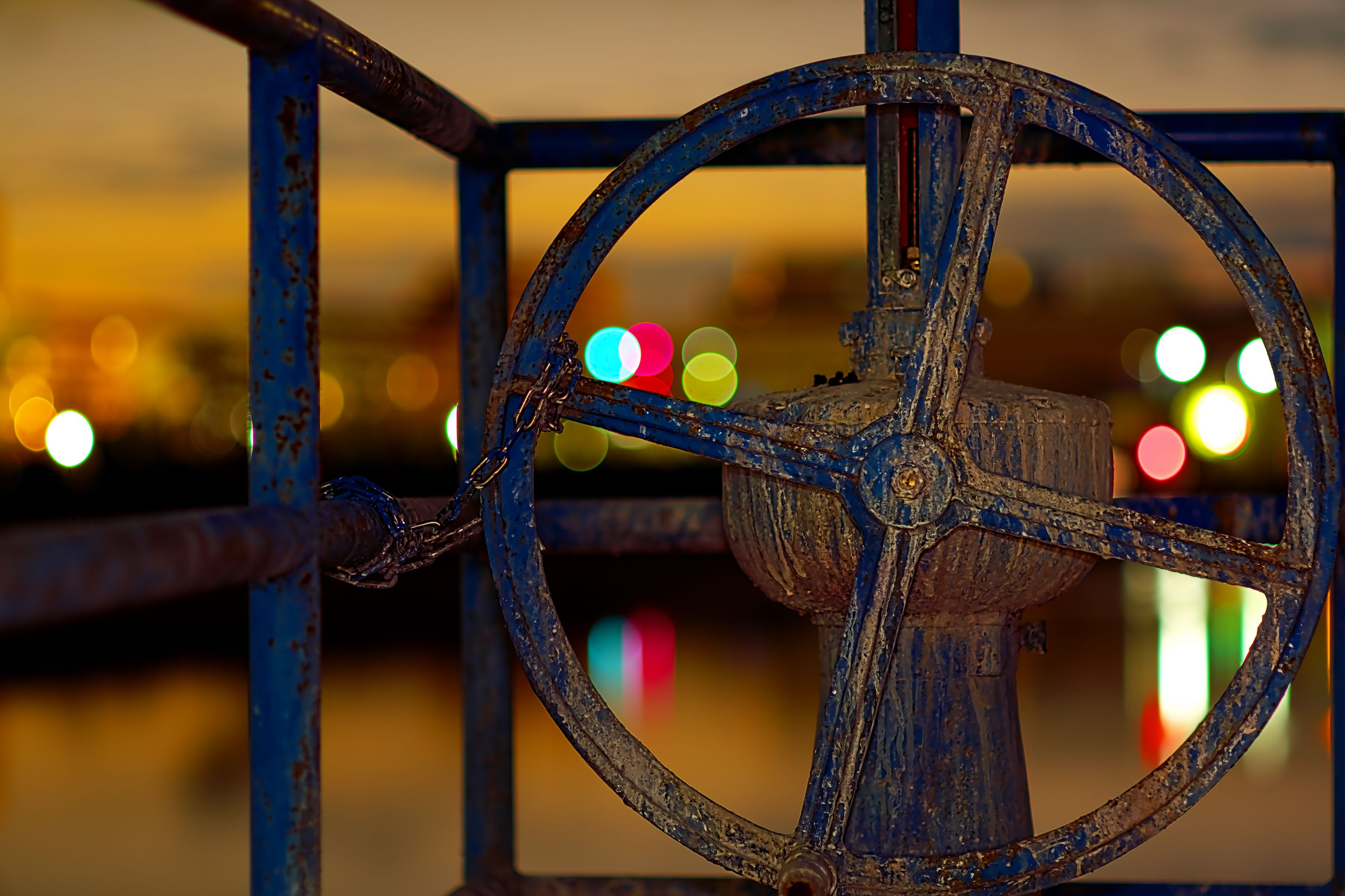 ため池の水門開閉ハンドルには鎖でむやみに開け閉めしないように鎖がついています