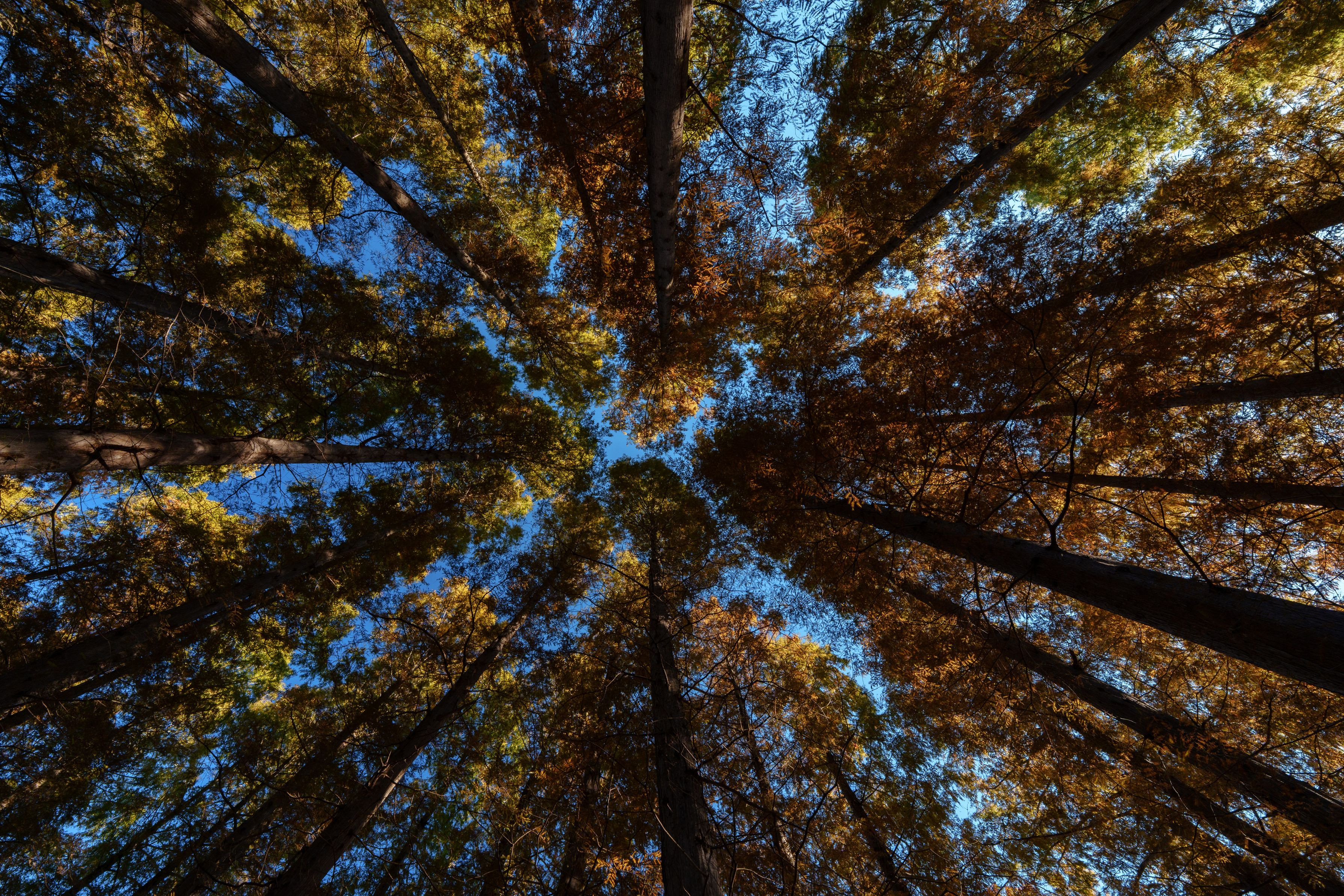 秋色に染まったメタセコイアを真下から見上げて撮影しました。まるで森に抱かれているような感覚になる場所でした。
