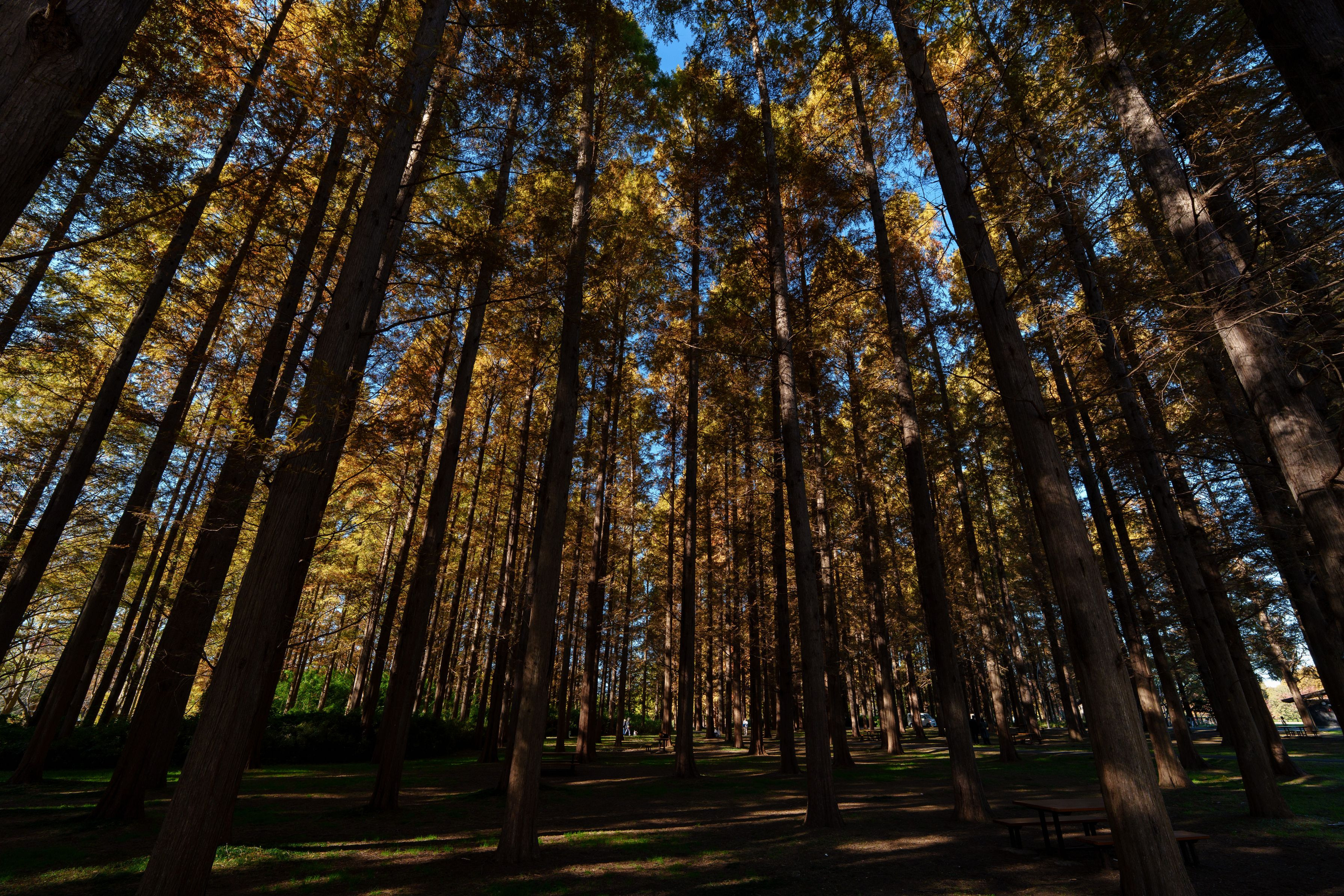 視界いっぱいに広がる秋。 空へ向かって高くそびえるメタセコイアの木々は、見上げると自分がちっぽけに感じるほどの迫力でした。