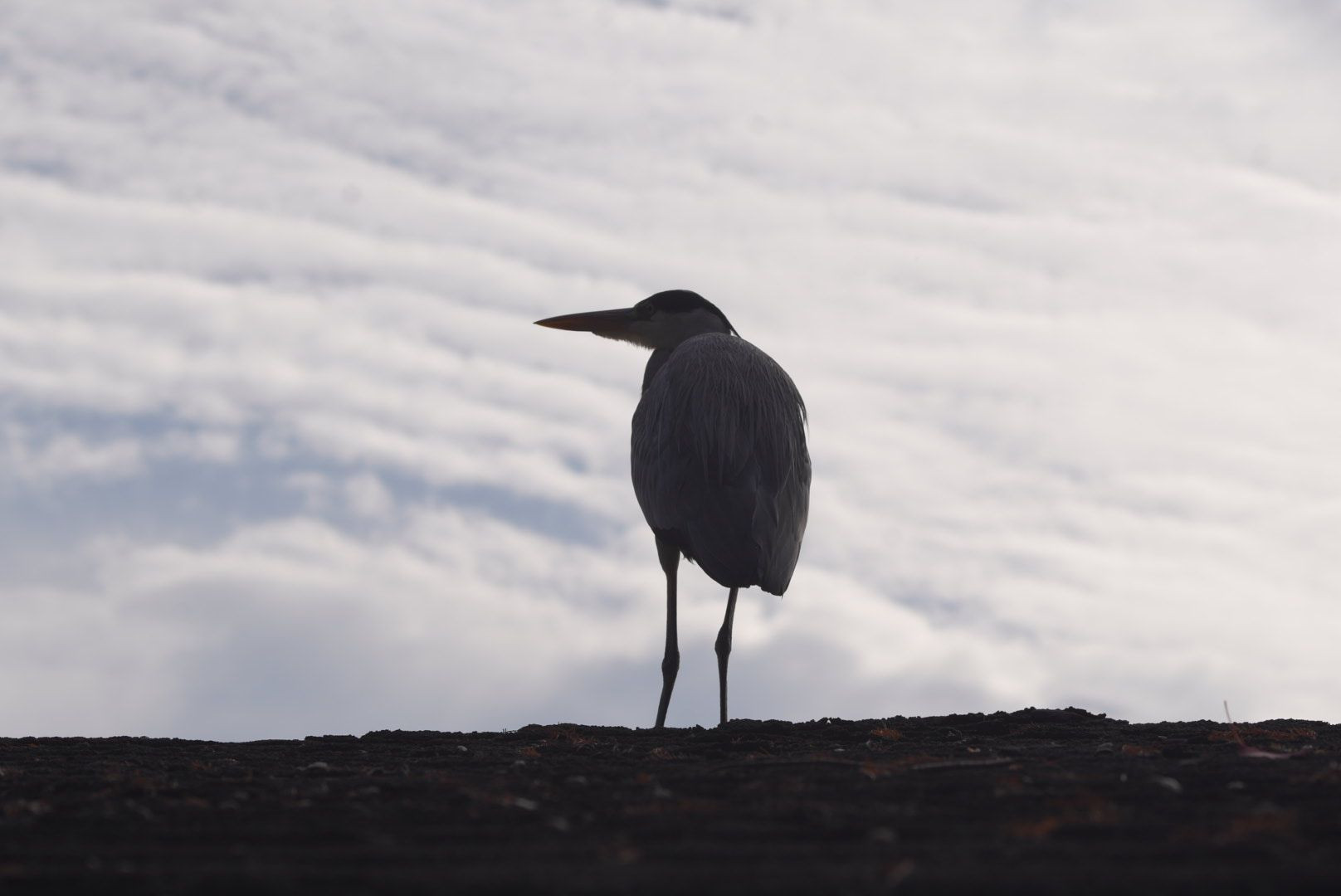 雲海の中にいるような錯覚になります。本当は斜めの屋根にダイサギがとまっているのを逆光で水平に撮影したものです。 マクロ150mm F8 でマニュアル撮影しました。