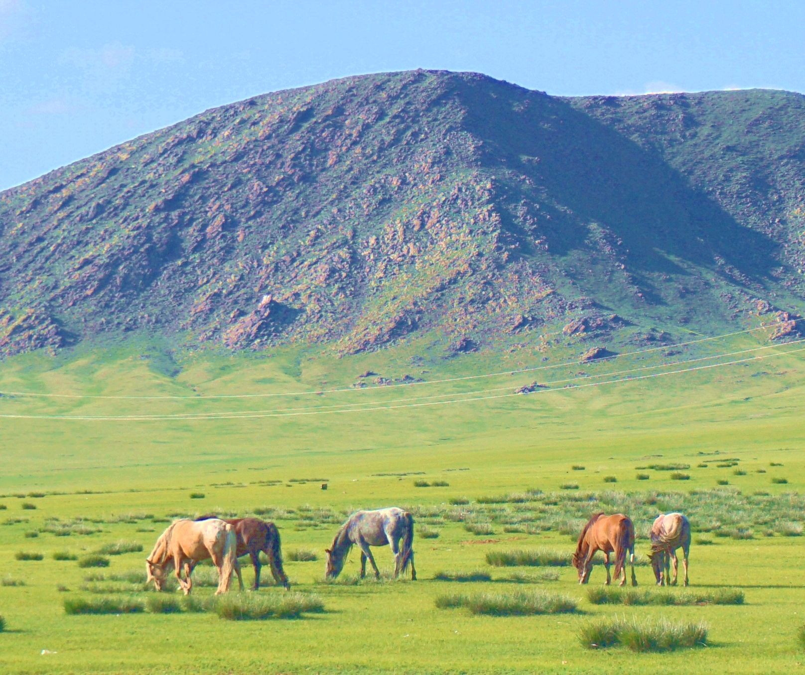モンゴル大草原の山の裾野で放牧されている馬たち。走行するバスの窓から撮りました。