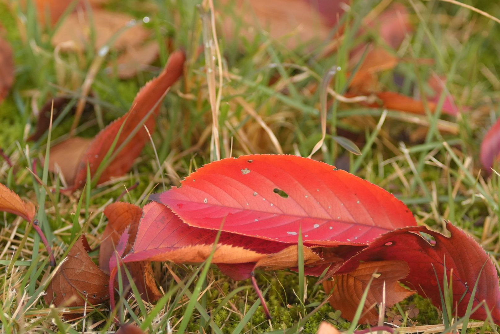 サクラの落ち葉が一面に落ちています。 緑の芝生との対比が赤をより際立たせています。 マクロ150mm F8 でマニュアル撮影しました。