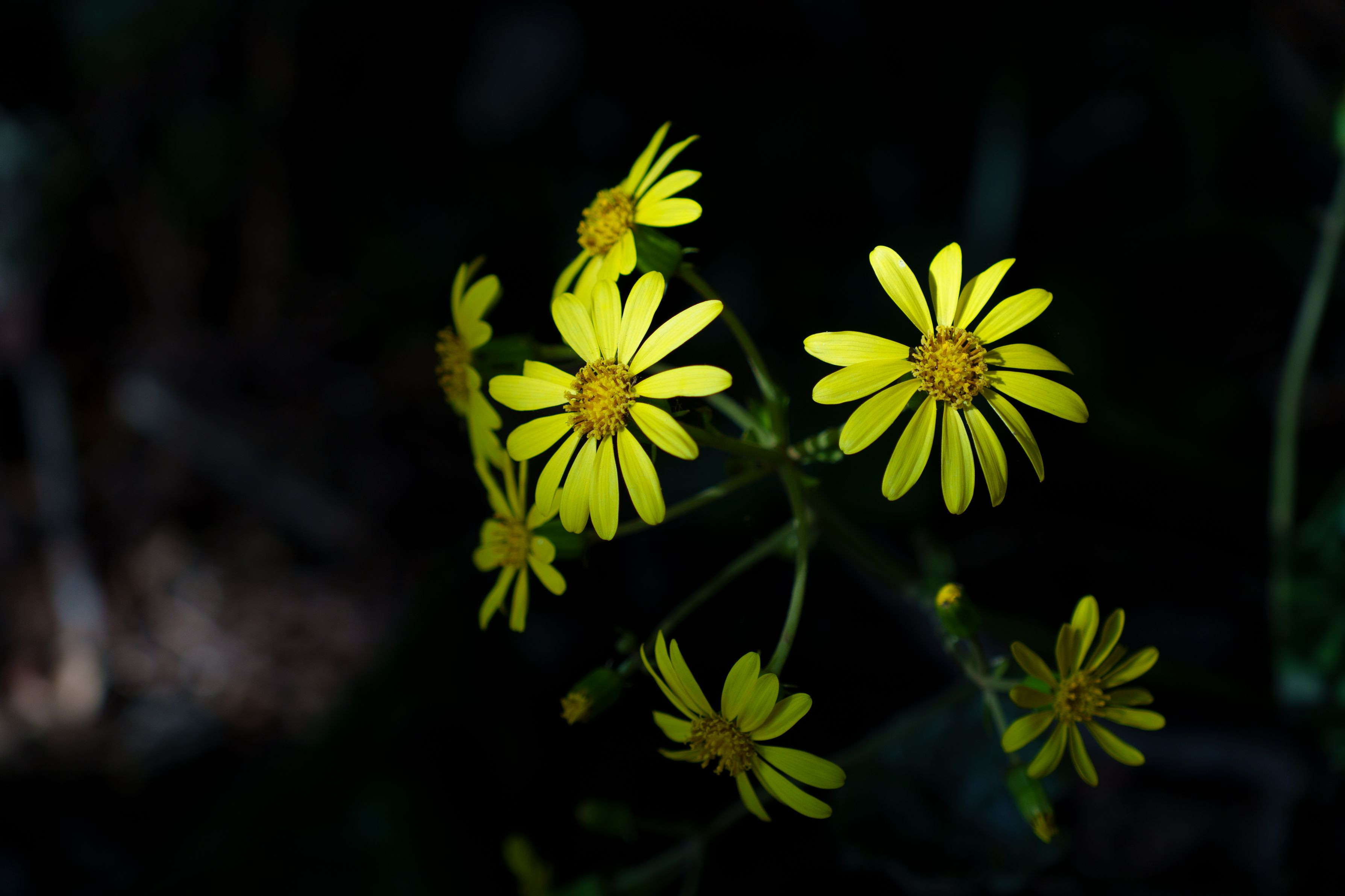 林道に咲くツワブキが、差し込む光を浴びてひときわ明るく輝いていました。